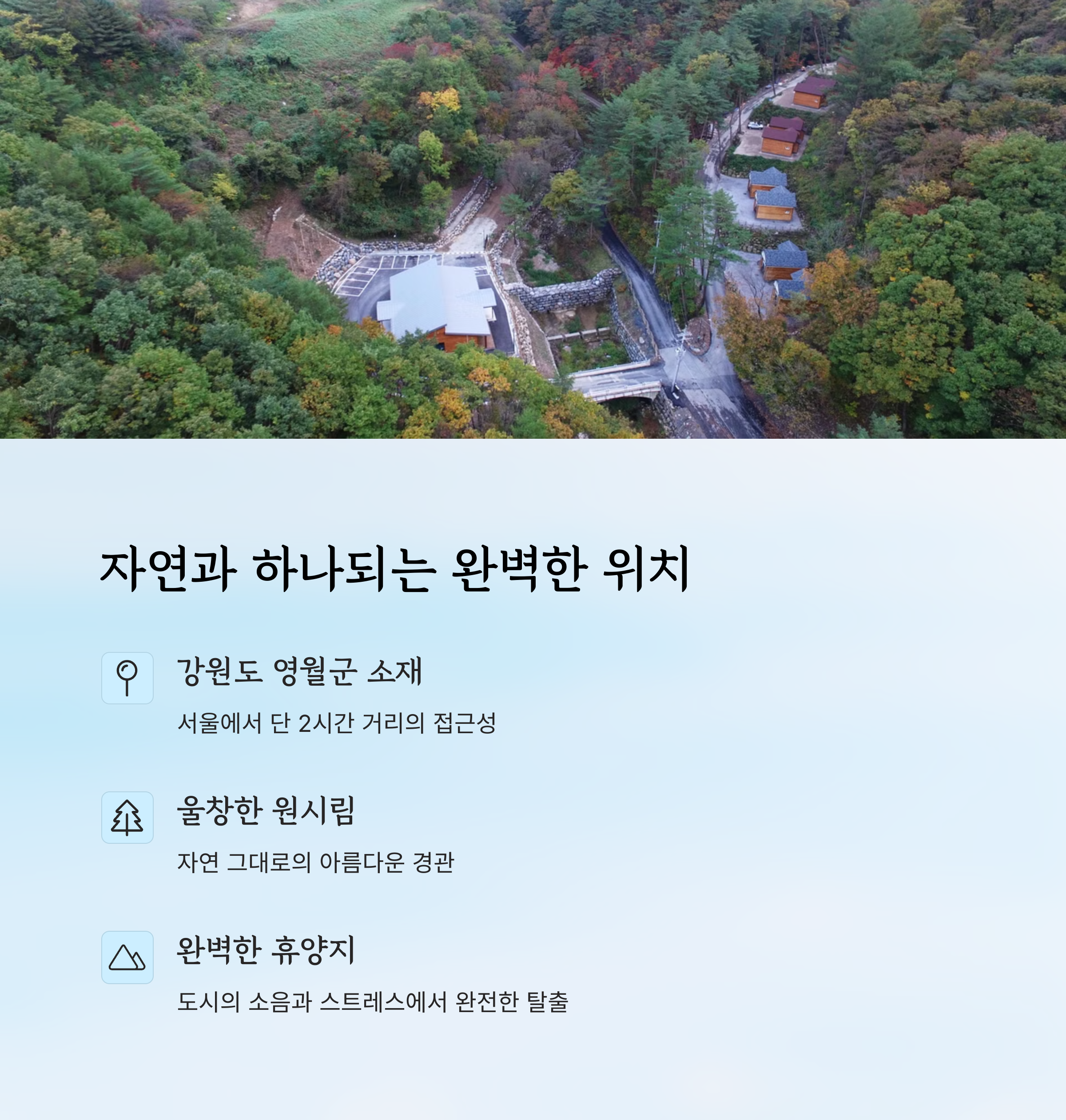 숙박 시설은 물소리동, 숲향기동 등 다양한 형태로 마련되어 있으며, 특히 숲향기동은 복층 구조로 설계되어 가족 단위 여행객에게 큰 만족을 줍니다. 실내는 깔끔하게 정리되어 있고, 바닥 난방과 에어컨, 냉장고 등 기본적인 편의 시설이 잘 갖춰져 있어 계절에 상관없이 이용이 편리합니다.