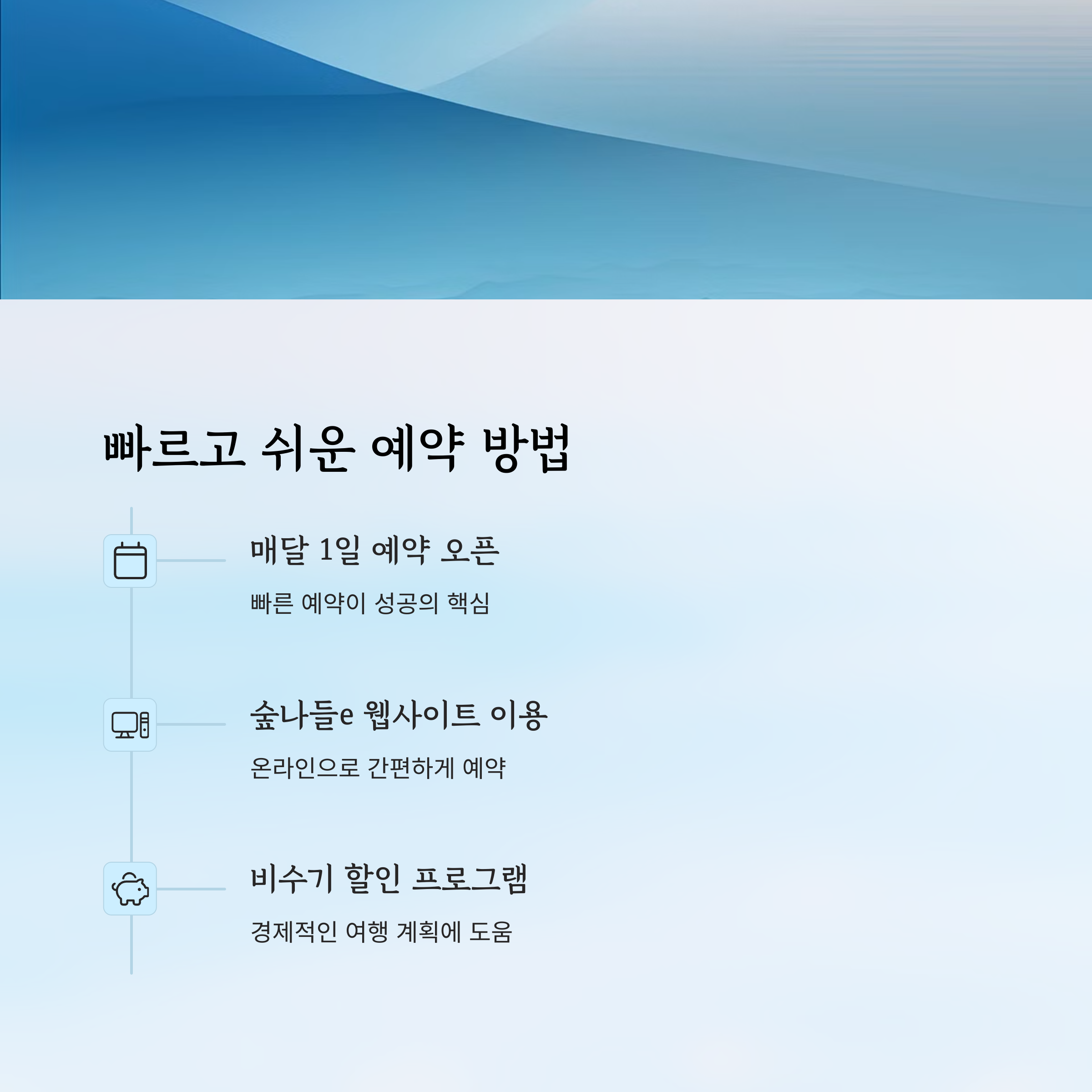 | 예약 방법 | 매월 1일 오픈, 숲나들e 홈페이지 통해 온라인 예약 |