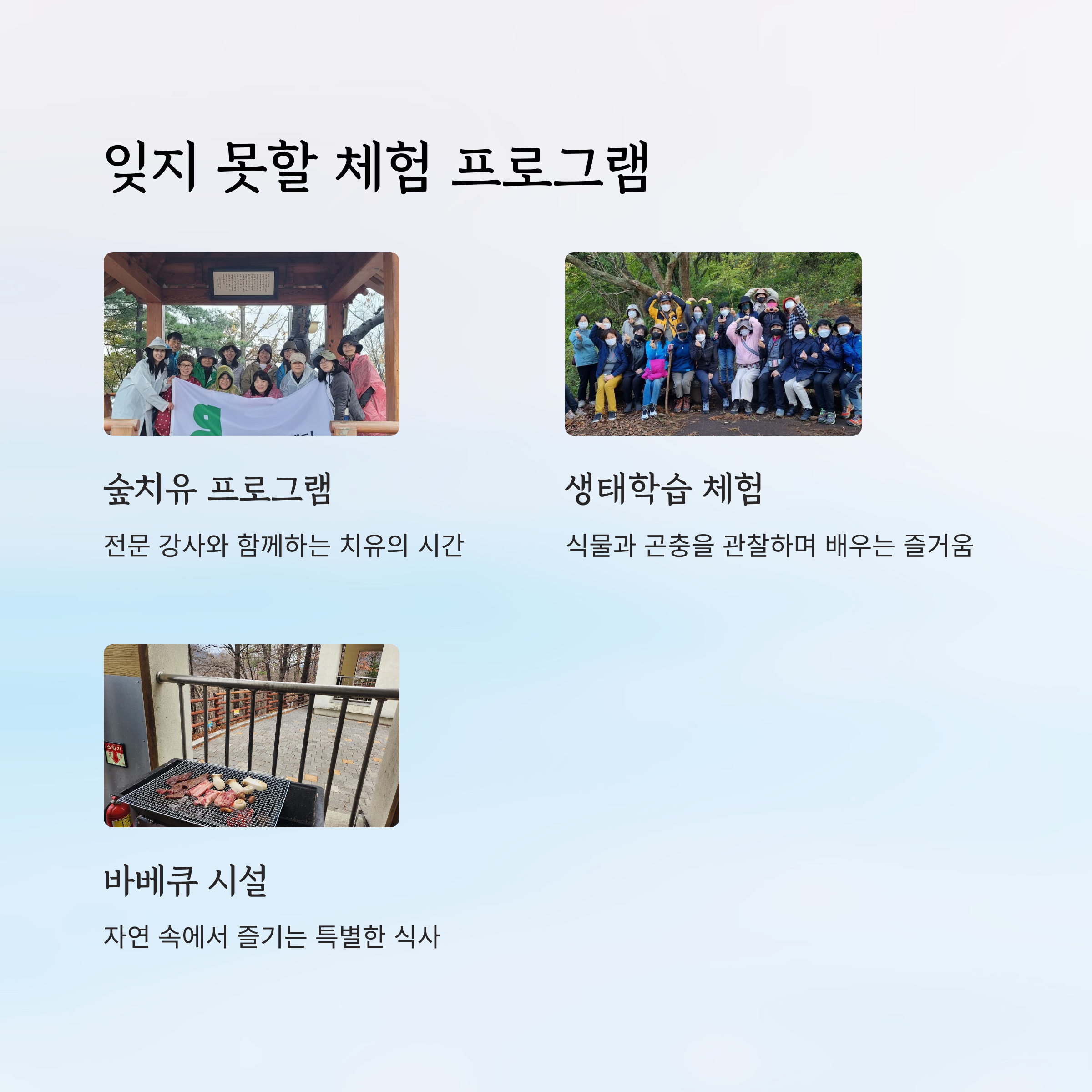 자연을 체험할 수 있는 숲치유 프로그램, 생태학습 체험도 운영됩니다. 어린이와 함께 참여하기 좋은 구성으로, 자연의 소중함을 배우고 체험할 수 있는 교육적 가치가 높습니다. 또한 야외 바베큐장도 잘 마련되어 있어 저녁 식사 시간의 분위기를 더욱 특별하게 만들어 줍니다.