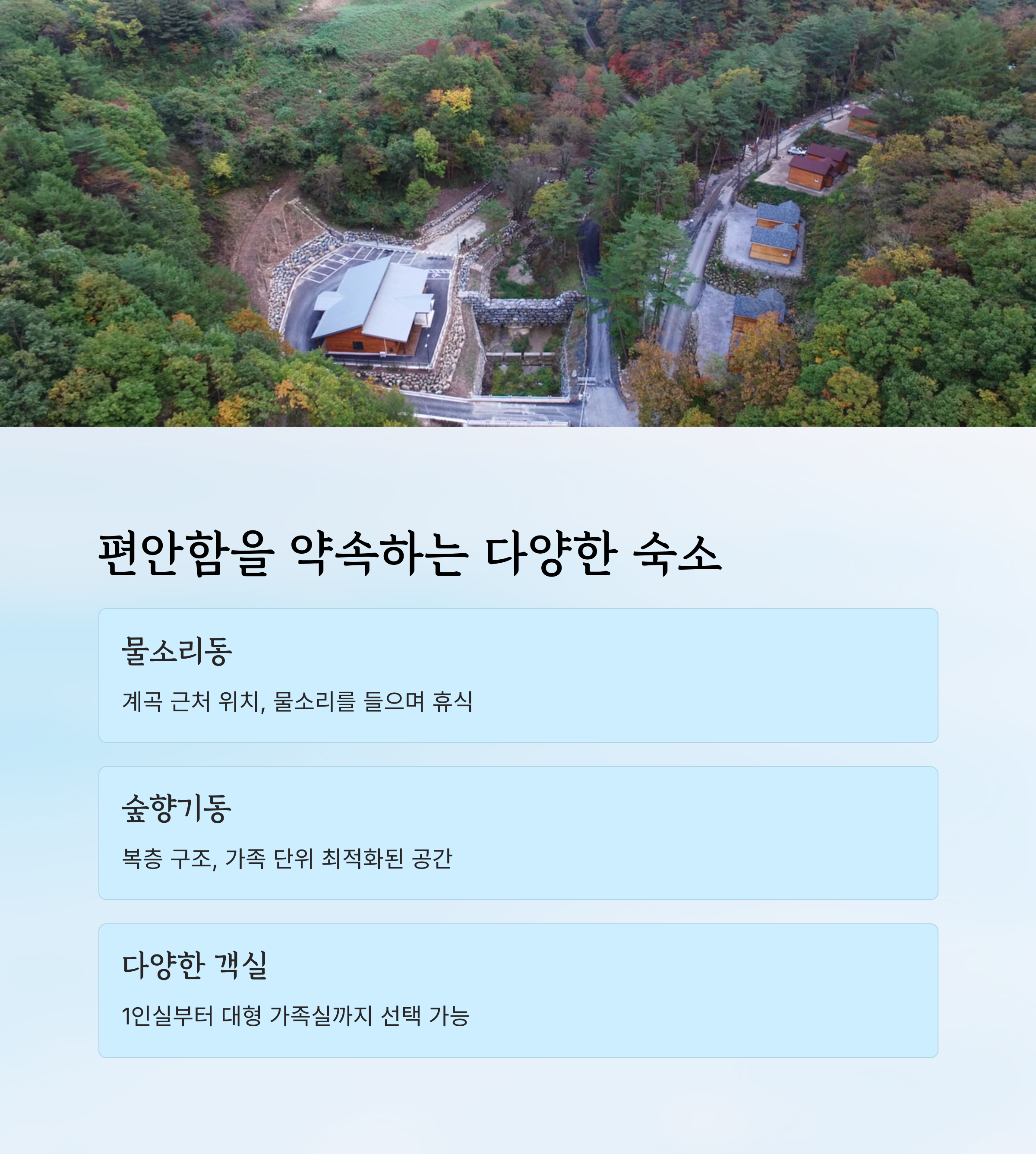 | 숲향기동 복층 구조, 물소리동 소형 숙소, 다양한 규모 | 숲치유, 생태학습, 바베큐, 야외 산책로 | 자연 속 조용한 휴식, 가족 단위 이용 만족도 높음 |