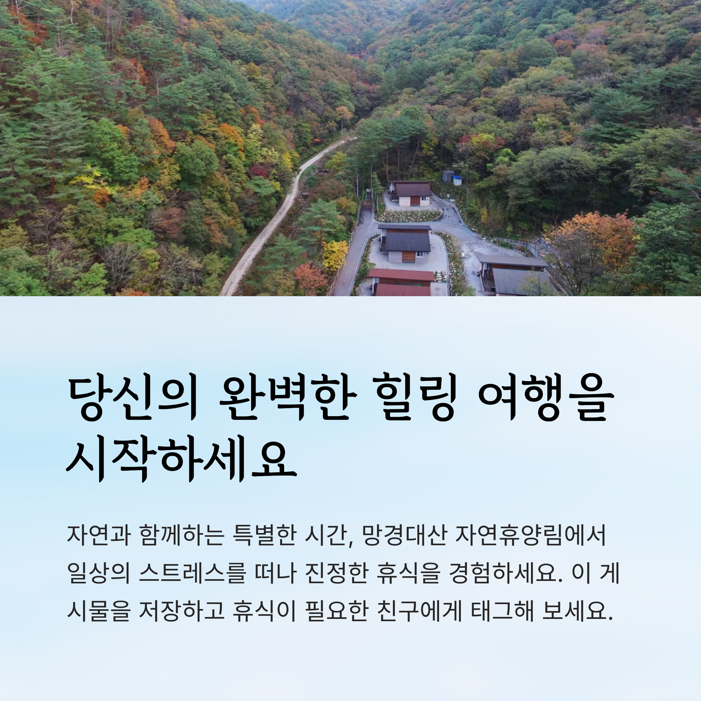 망경대산 자연휴양림은 강원도의 맑고 깊은 숲 속에서 진정한 쉼과 치유를 경험할 수 있는 곳입니다. 가족과 함께 조용한 시간을 보내거나, 자연을 배경으로 산림욕과 체험 활동을 즐기고 싶은 분들에게 완벽한 선택이 될 것입니다. 자연의 품속에서 보내는 하루는 일상에 지친 마음을 따뜻하게 위로해줍니다.