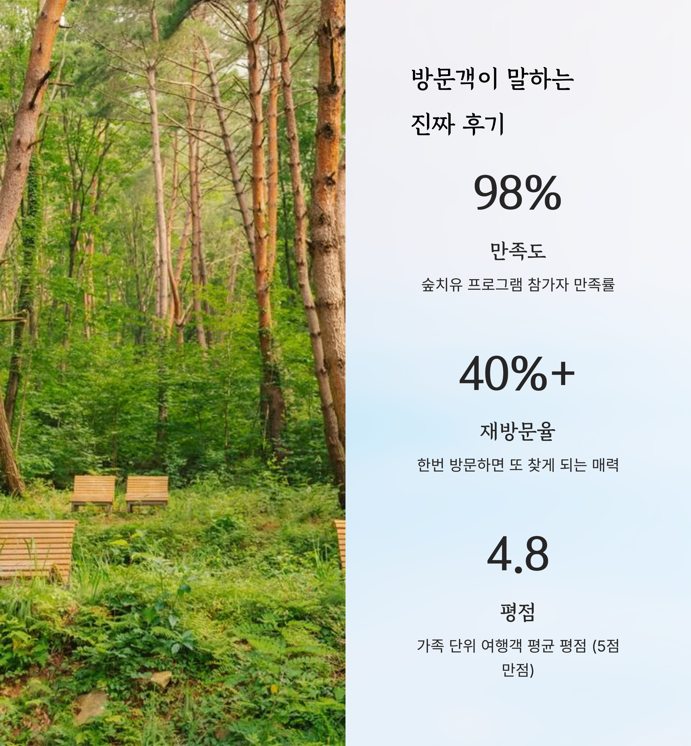 | 예약은 매월 1일 시작, 숲나들e 홈페이지 | 체험 참여 시간표는 숙소 안내문 참조 | 사계절 풍경 모두 아름다워 재방문율 높음 |