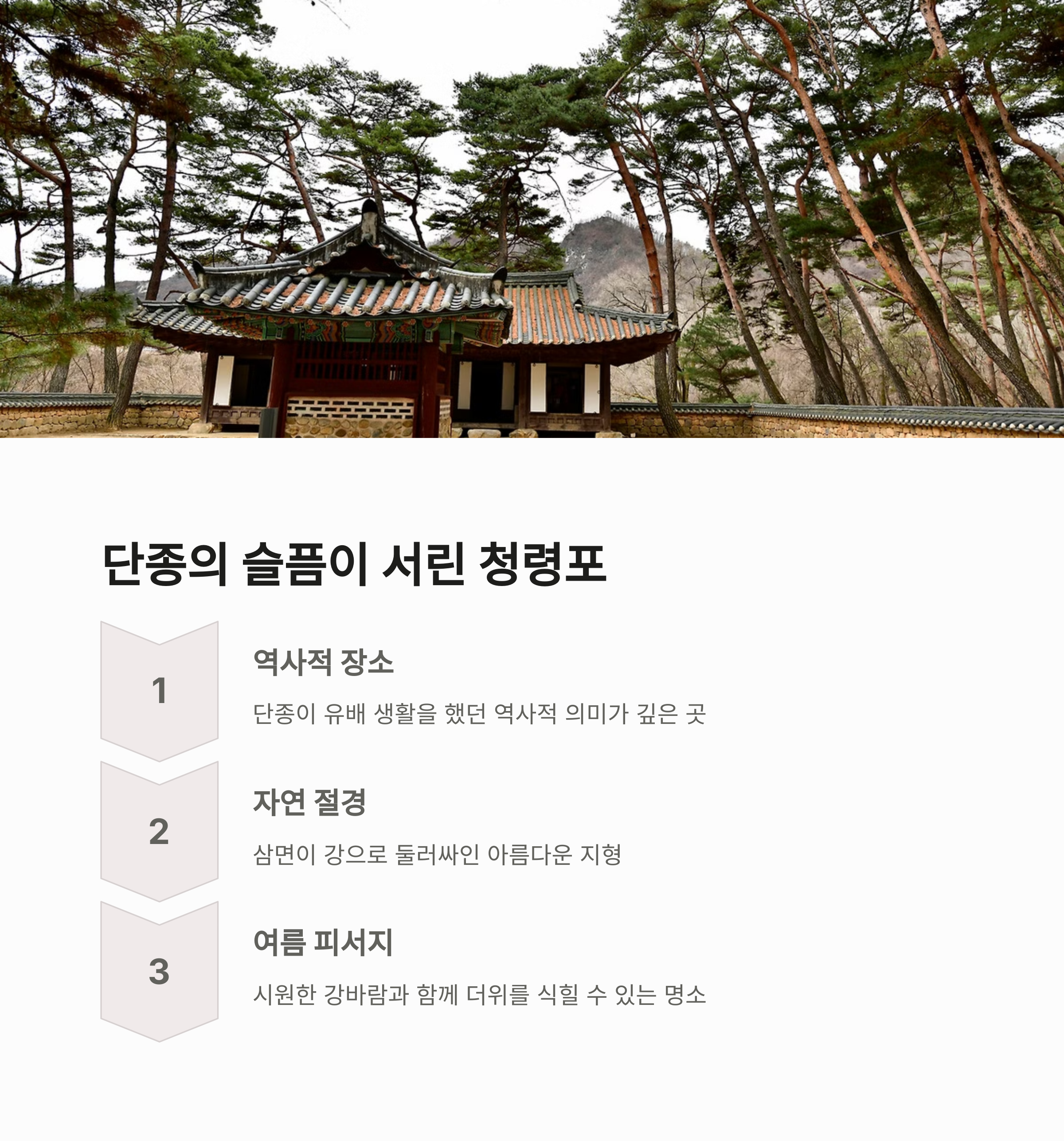 | 장릉 청령포 김삿갓 문학관 | 천돌바위 고씨굴 서강 풍경 | 3~5시간 코스 반려견 동반 가능 문화 해설 제공 |