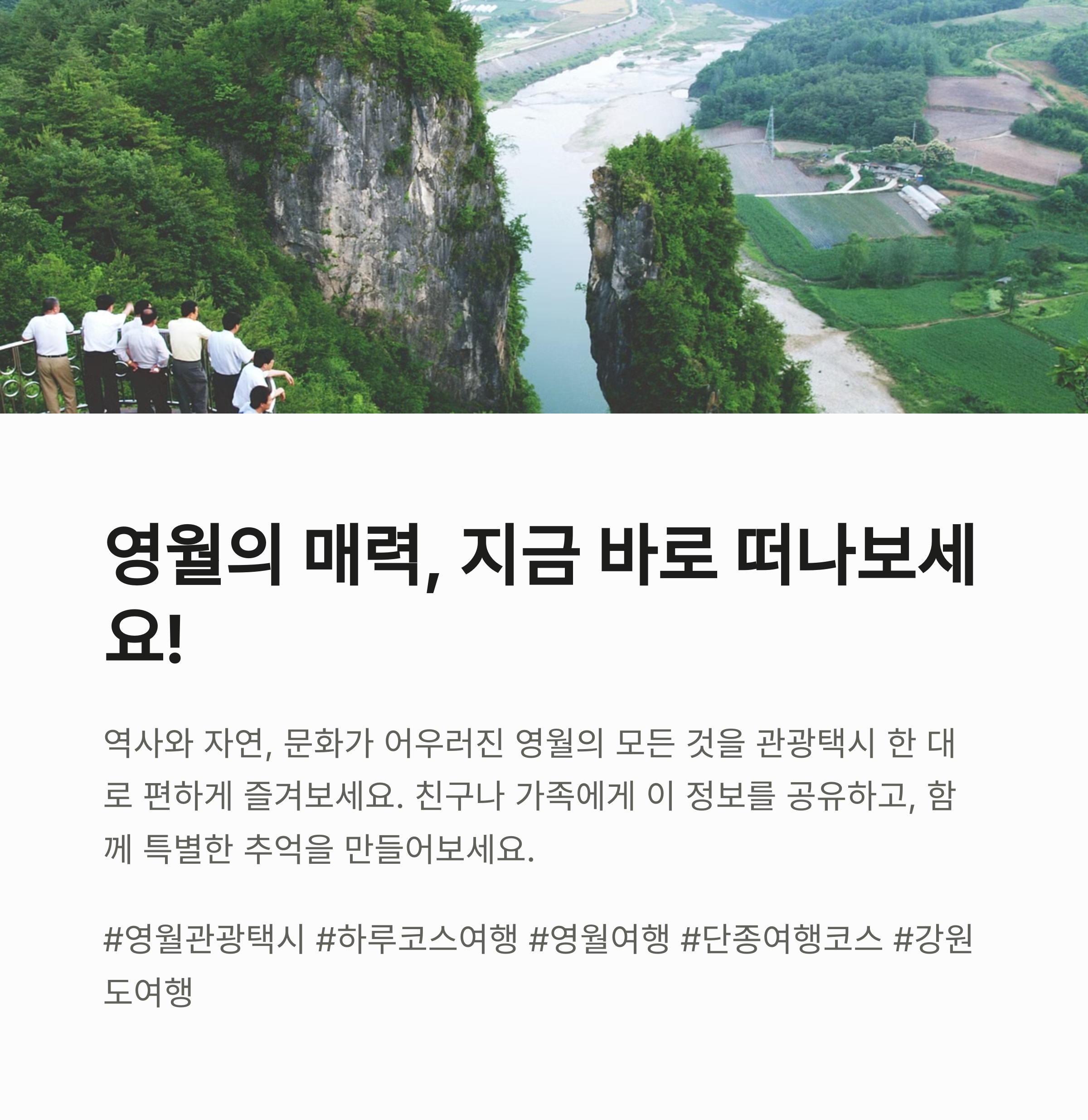 영월 관광택시는 차 없이도 안전하고 깊이 있는 영월 여행을 할 수 있는 최고의 교통+해설 패키지입니다. 문화유산, 자연풍경, 전시공간까지 하루에 모두 경험할 수 있어 누구와 떠나도 만족도 높은 코스가 완성돼요. 영월의 새로운 매력을 발견하고 싶다면 관광택시를 꼭 추천드립니다!