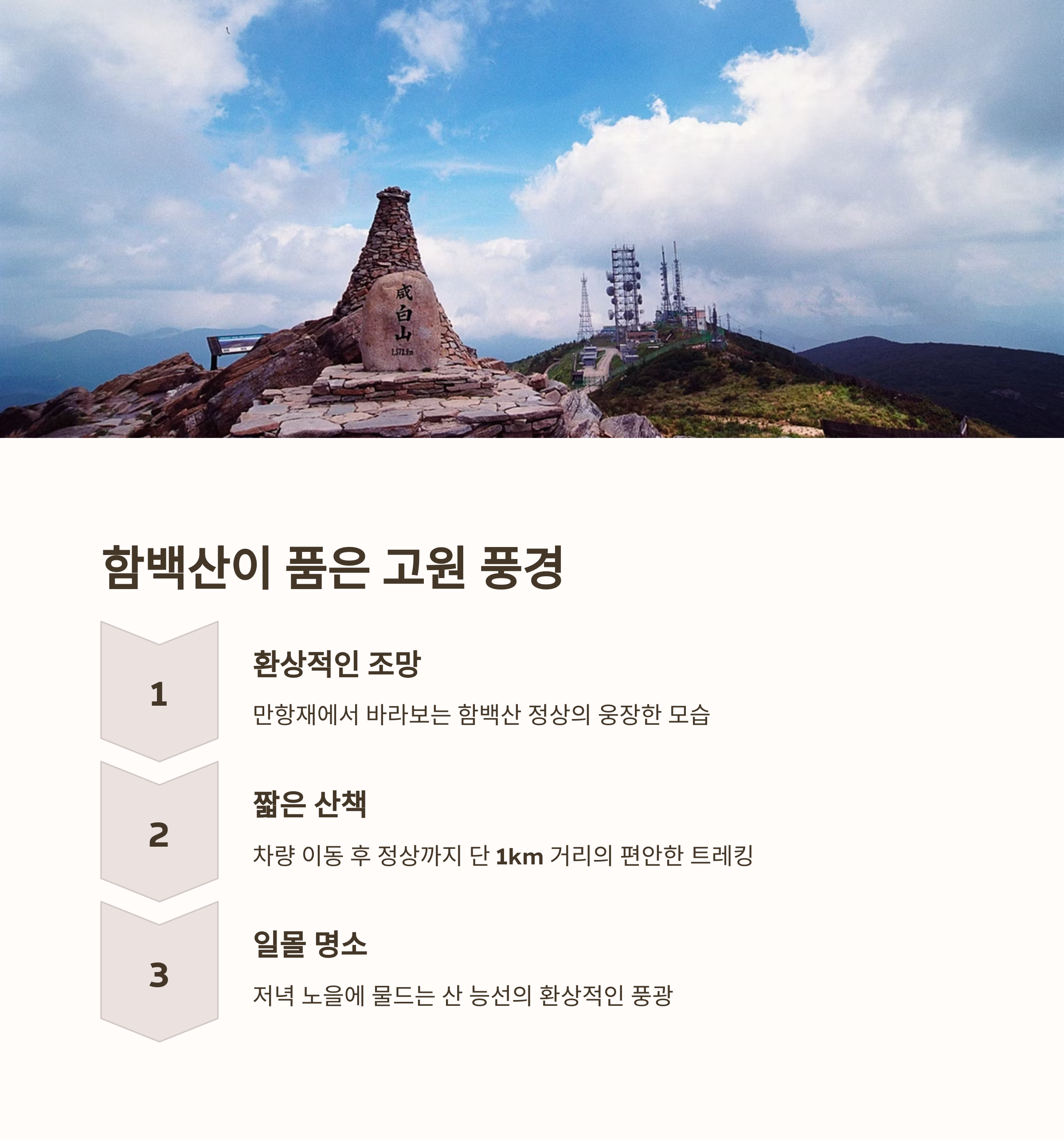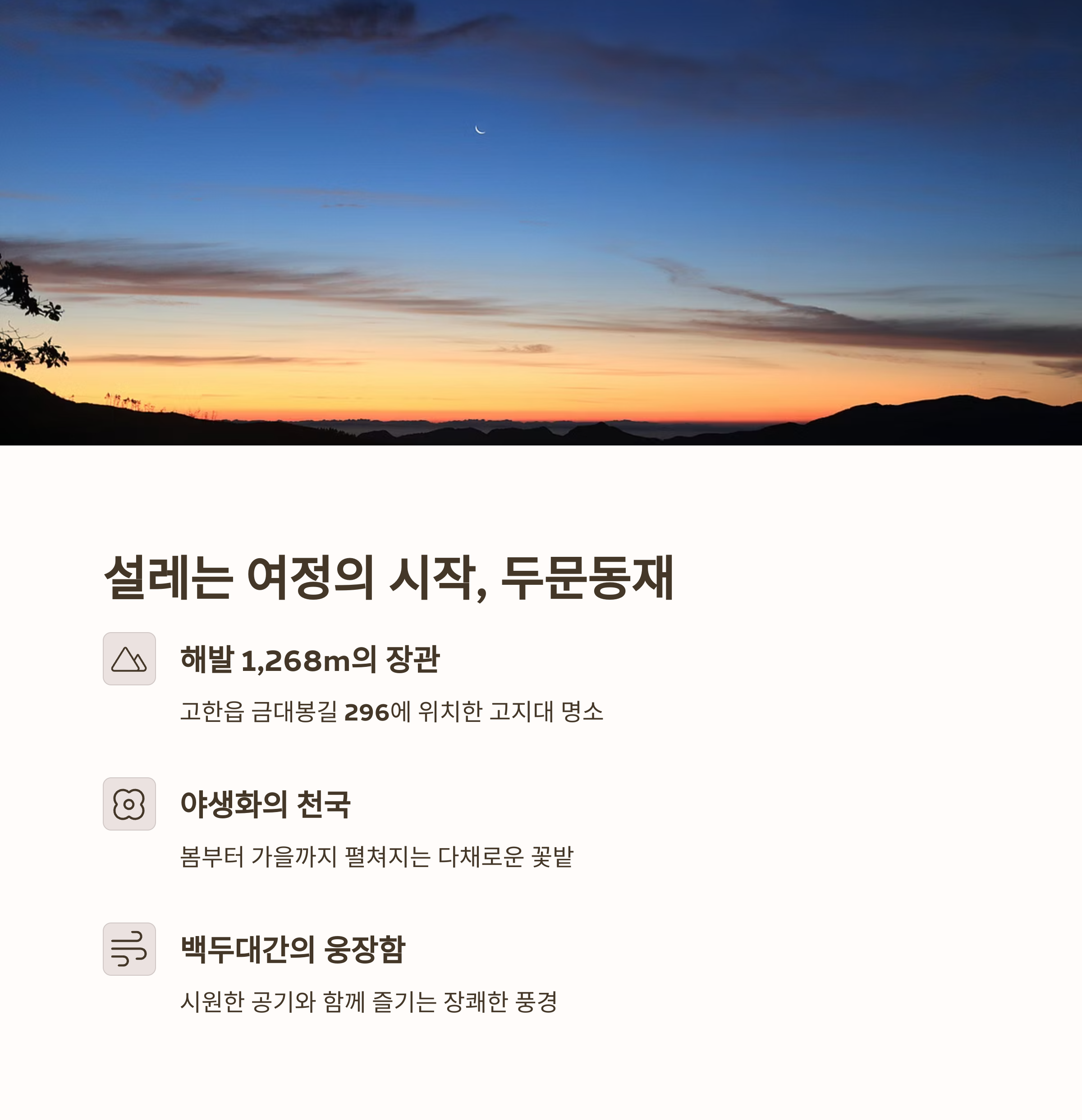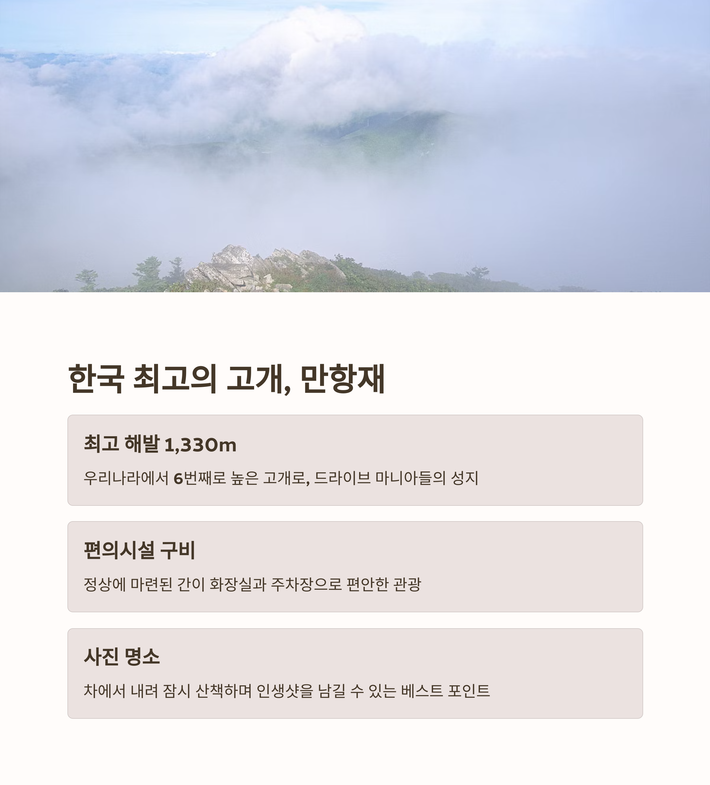 | 해발 1,268m 백두대간을 넘는 스카이로드 | 야생화, 안개, 계절마다 다른 자연 경관 | 역사와 자연이 어우러진 산중 사찰 명소 |