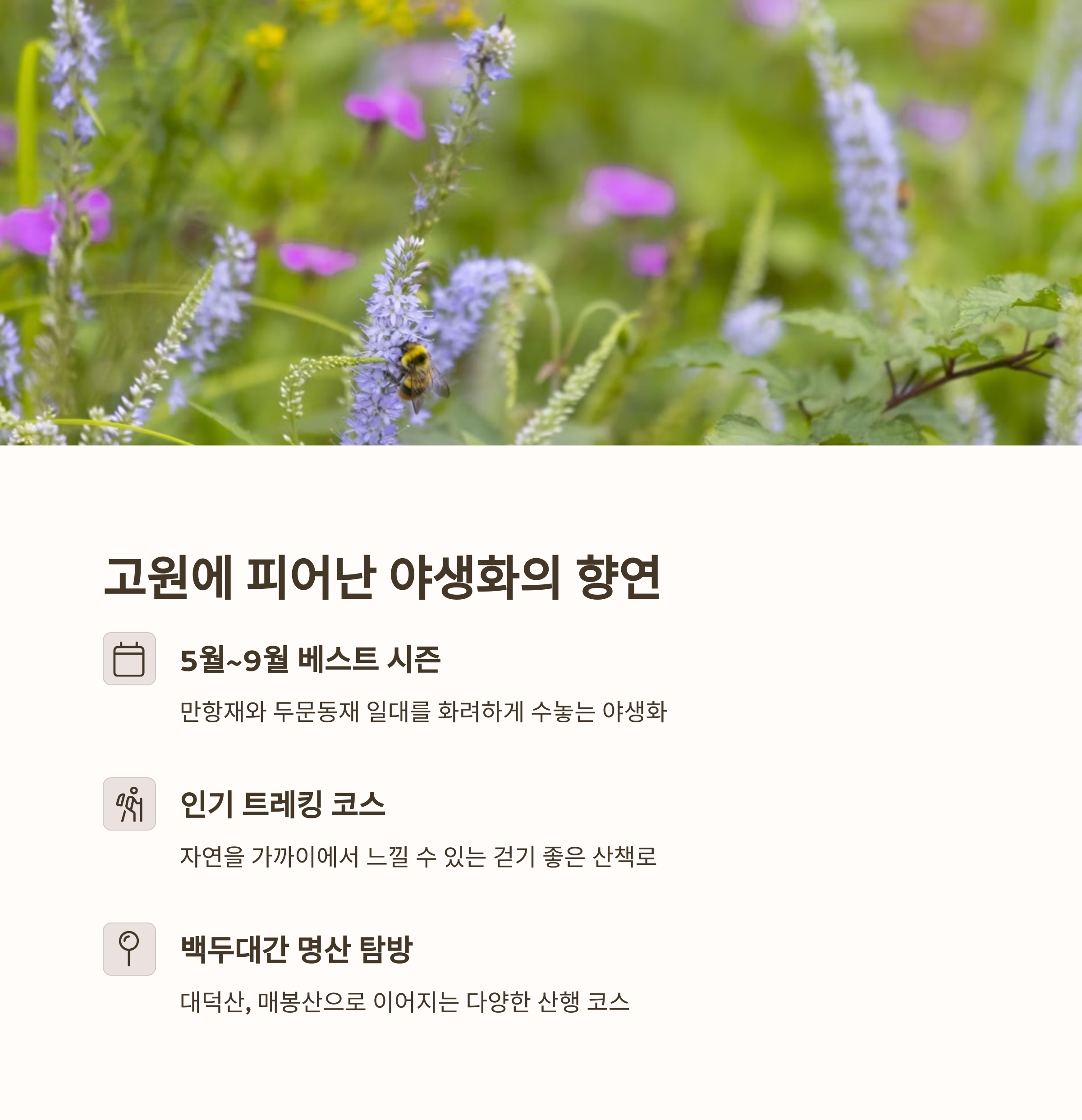 | 특징 | 고원지대 풍경, 야생화 산책로, 적멸보궁과 역사문화 명소 |