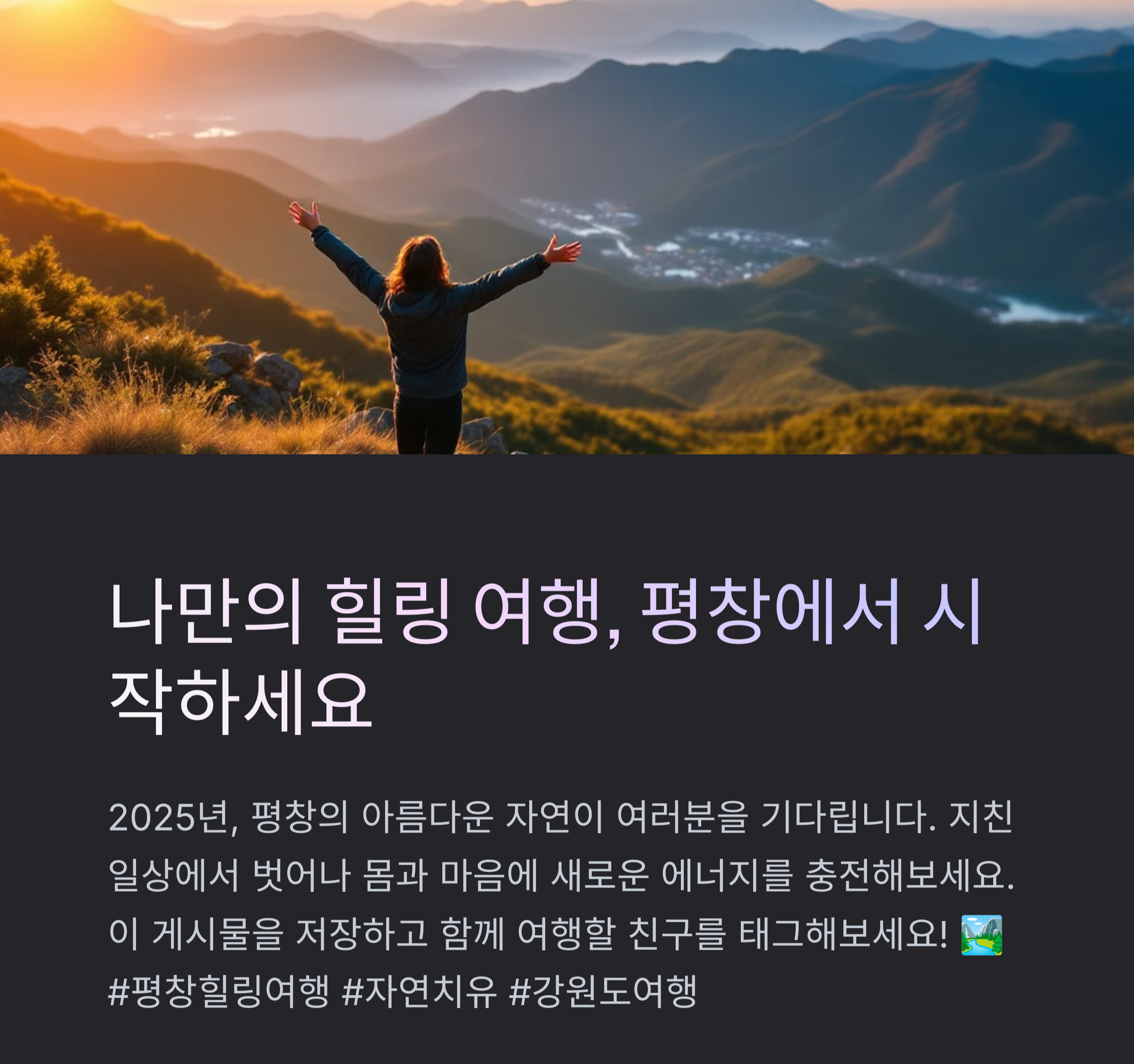강원도 평창은 자연과 함께하는 최고의 힐링 여행지입니다. 아름다운 풍경 속에서 여유롭게 산책하고, 피톤치드 가득한 숲길을 걸으며 몸과 마음을 정화해 보세요. 여러분의 여행이 더욱 특별한 추억으로 남길 바라며, 다음 여행지 추천도 기대해 주세요!