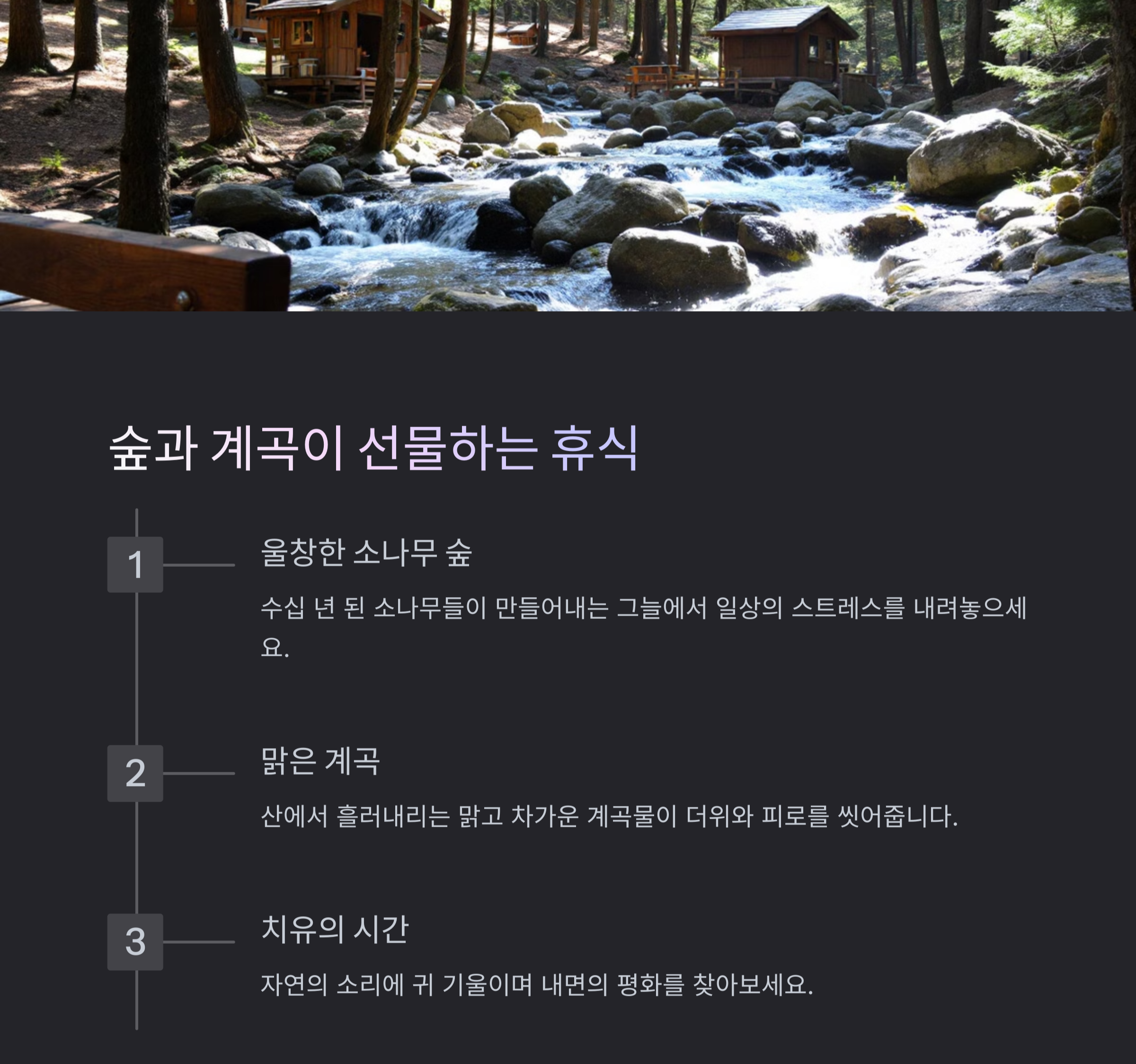 | 추천 이유 | 아름다운 자연과 함께 몸과 마음을 치유할 수 있는 힐링 명소입니다. |