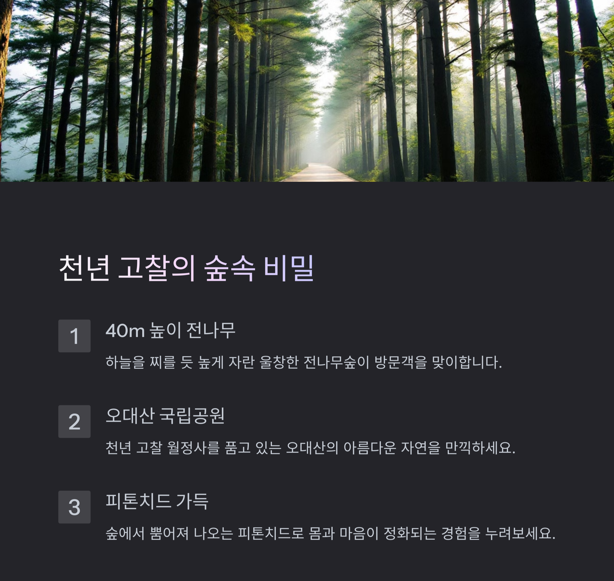 | 월정사 전나무 숲길 | 40m 전나무 숲길, 피톤치드 가득 | 건강에 좋은 힐링 코스 |