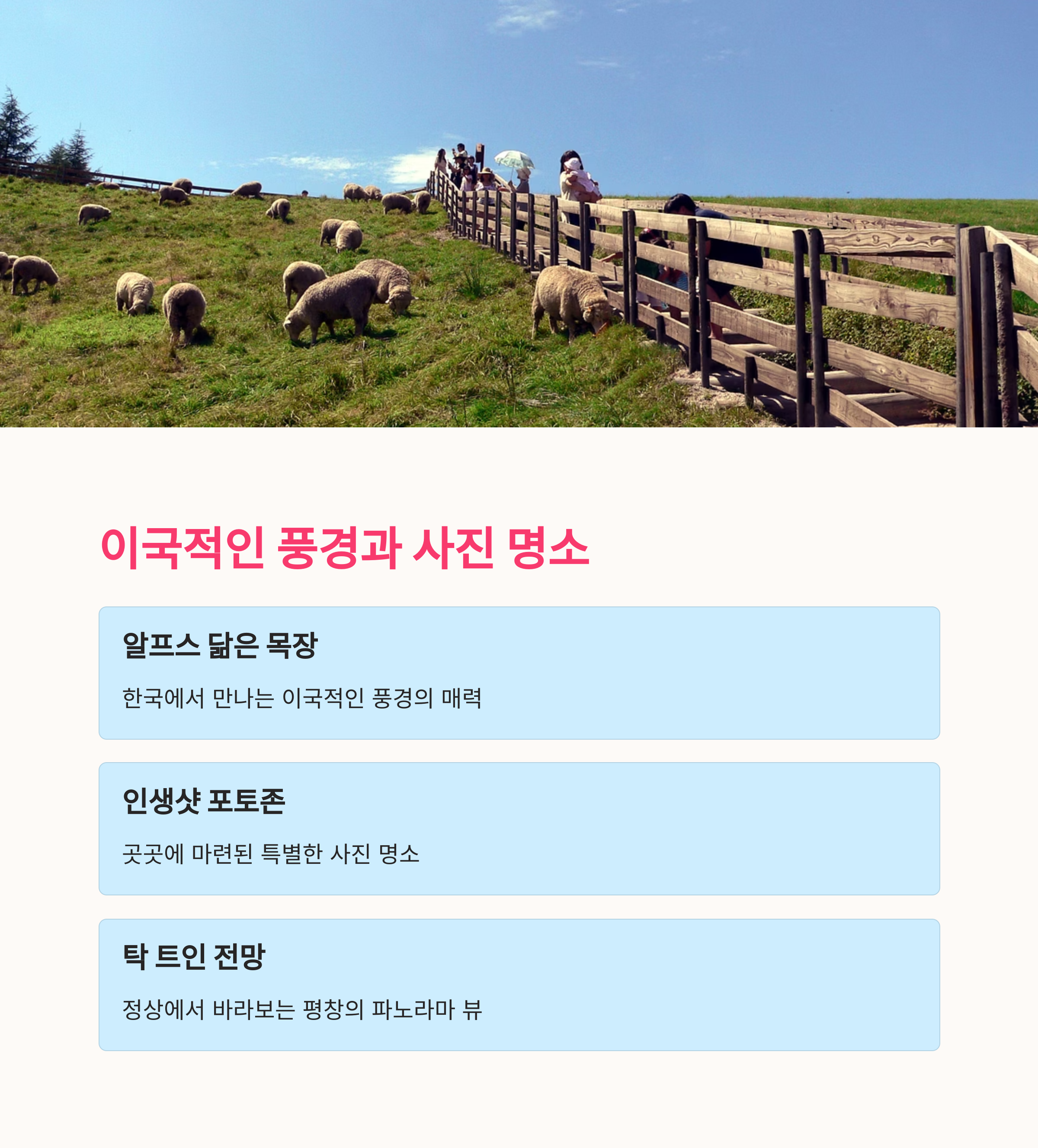 봄 추천 포인트 | 푸른 초원 산책로, 양 먹이주기, 전망대 전경 감상 |