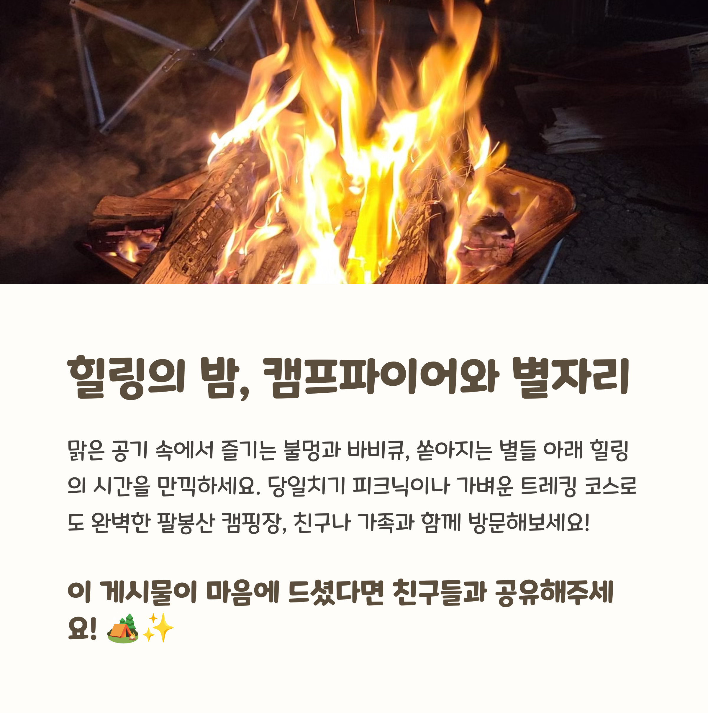 팔봉산 캠핑장은 도심을 벗어나 자연 속 힐링을 원하는 차박러들에게 꼭 한 번 추천하고 싶은 장소입니다. 강물 소리, 불멍, 별빛 아래에서 보내는 밤은 누구와 함께하든 잊지 못할 여행이 될 거예요.
