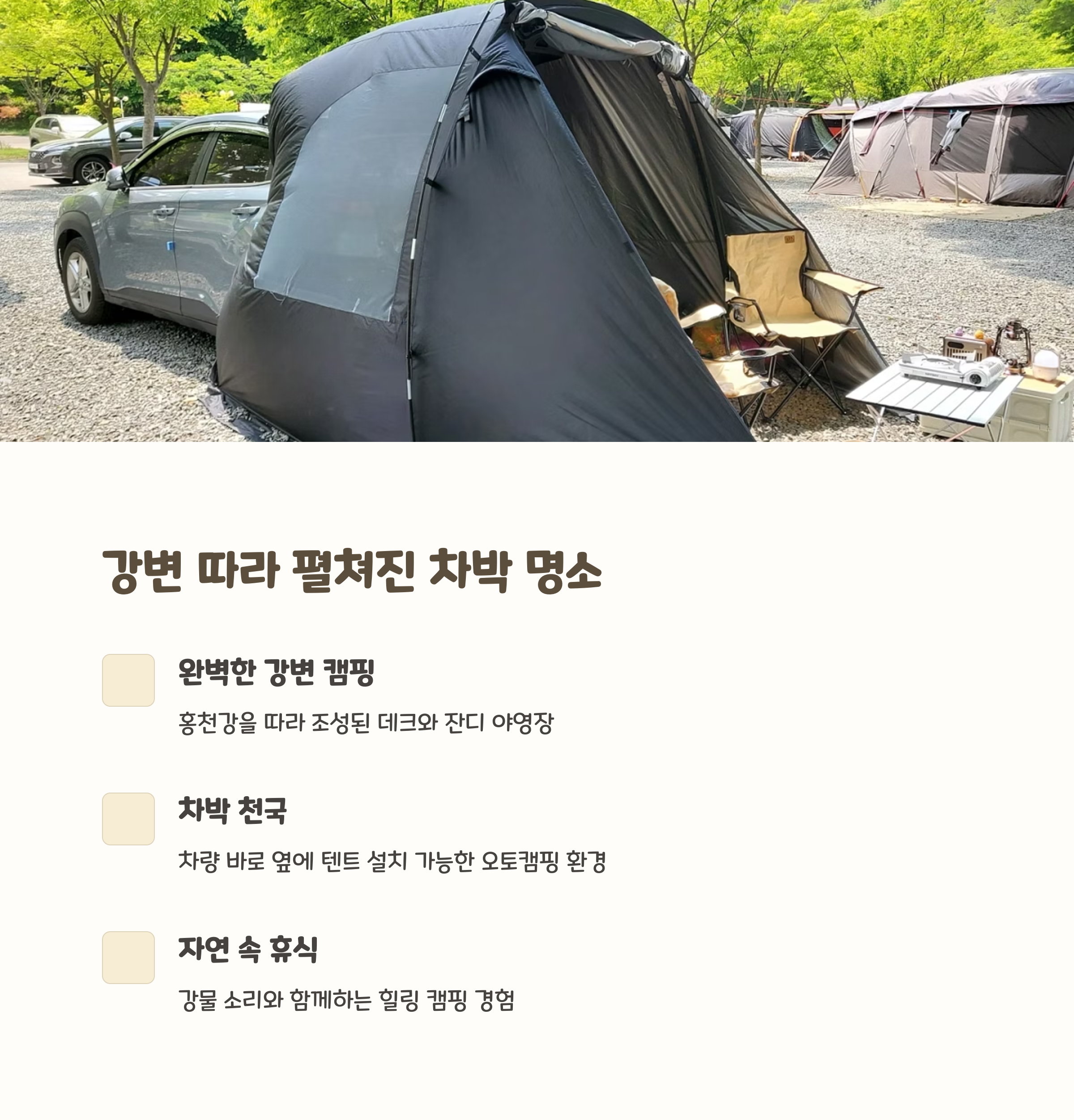| 차박감성, 차량텐트설치 | 캠핑초보, 잔디야영장 | 홍천강, 물놀이포인트 |