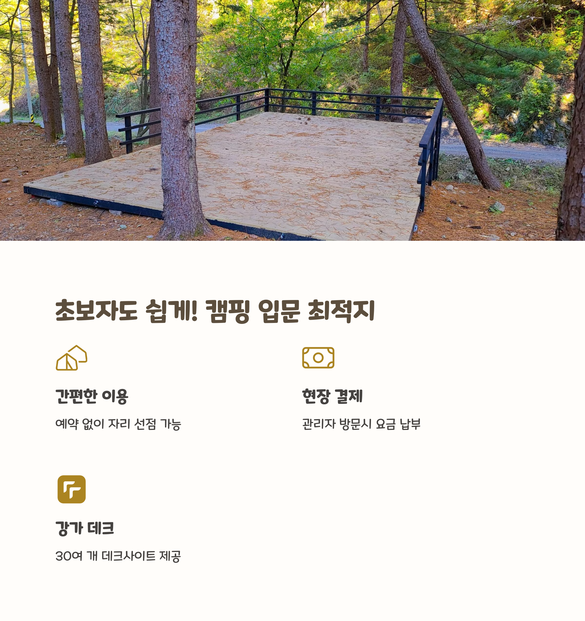 | 추천 포인트 | 강변 차박 가능, 데크·잔디존 구성, 물놀이·불멍·트레킹까지 원스톱 즐기기 |