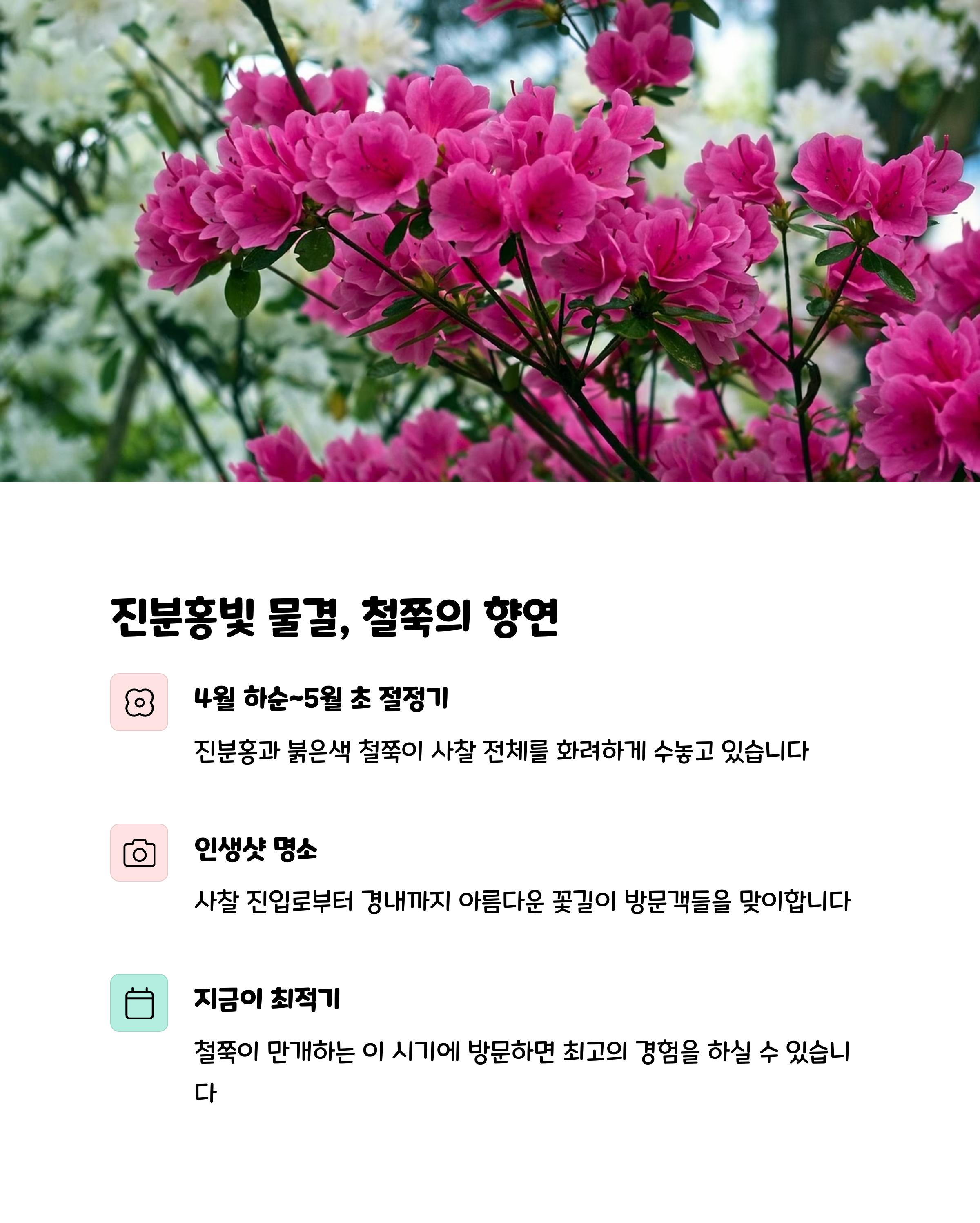 4월 하순~5월 초 절정, 현재 만개 중 | 철쭉터널, 사찰 기와지붕 앞, 정문 진입로 | 오전 8시 전 도착 권장, 평일 방문 추천 |