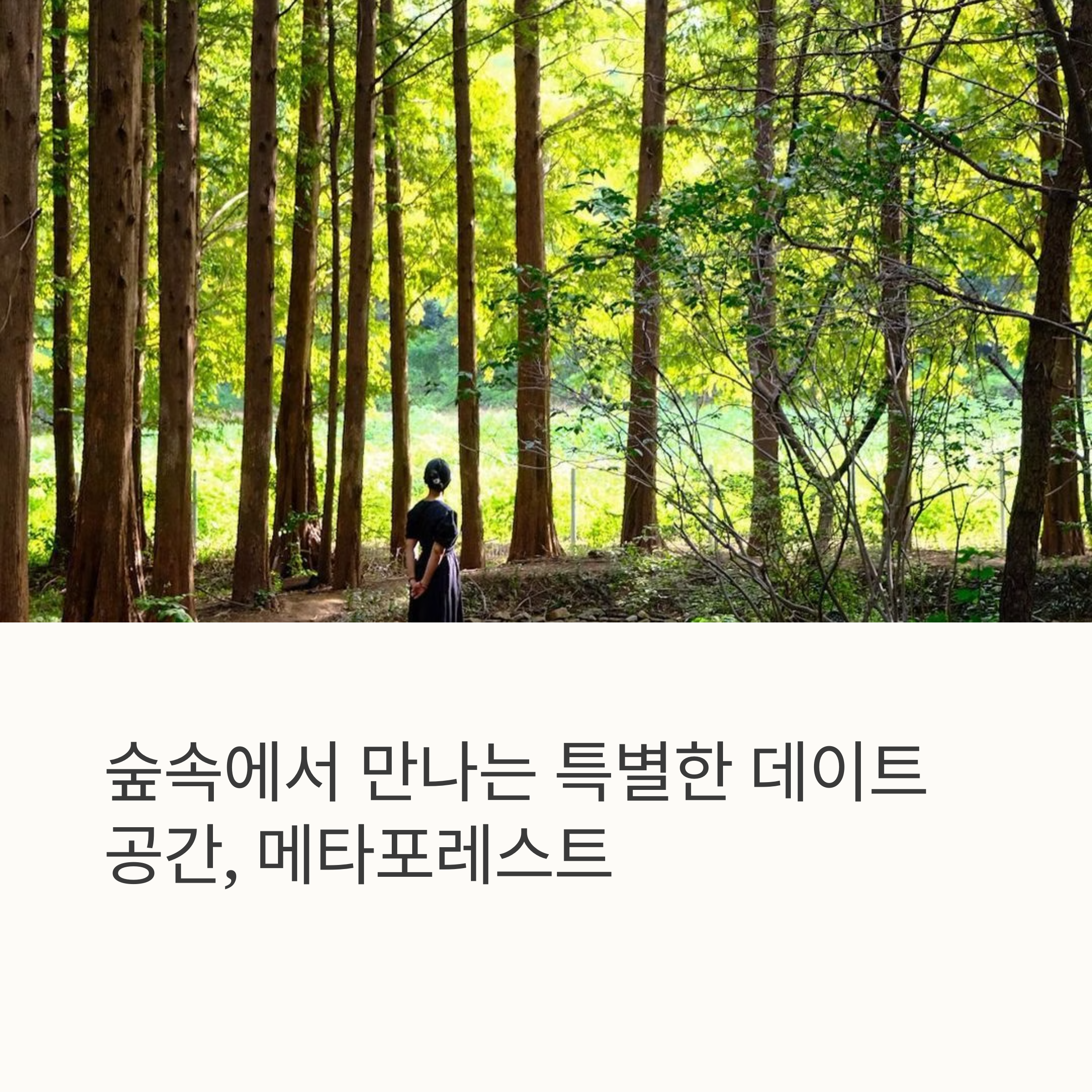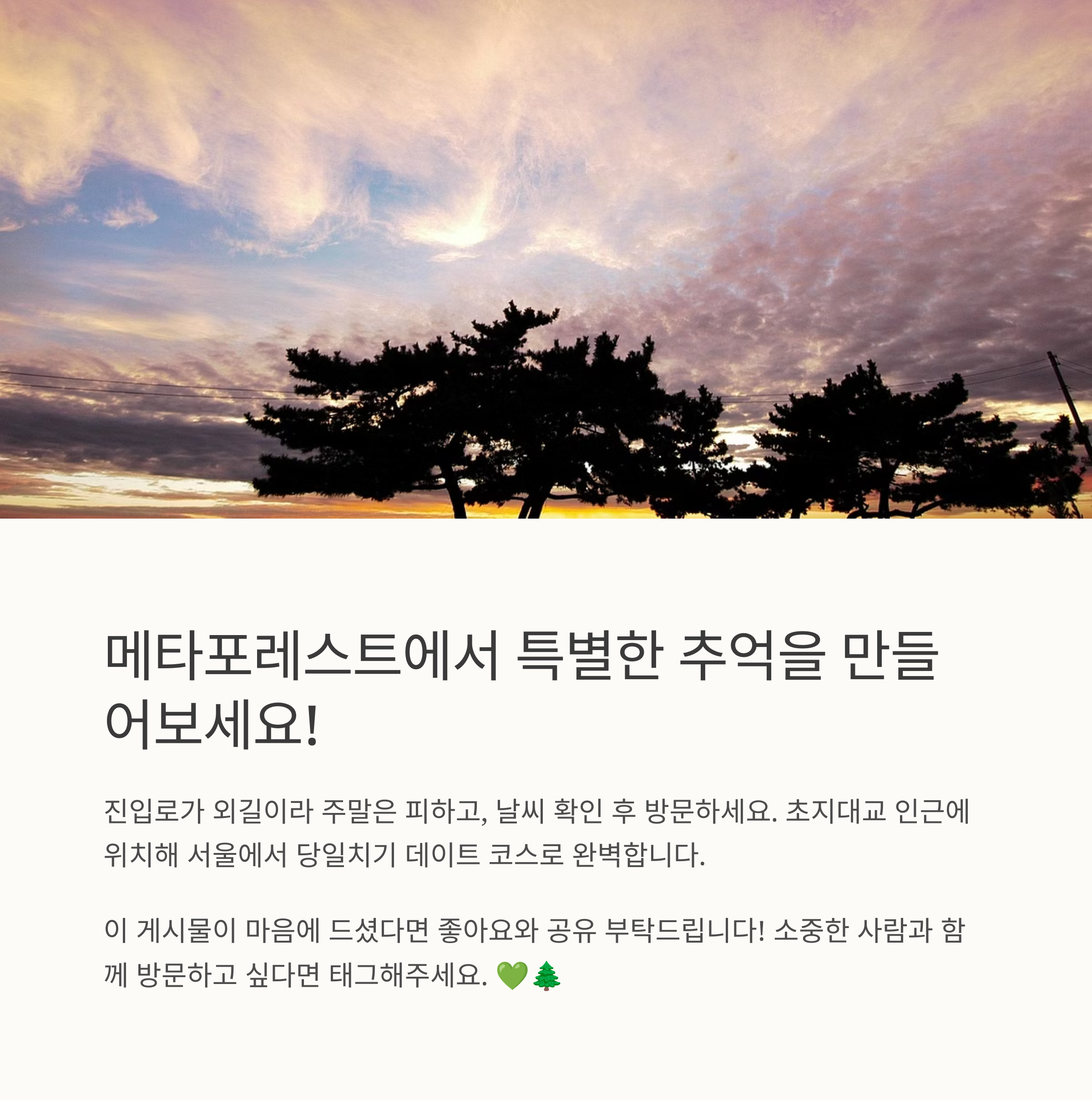 메타포레스트는 서울에서 1시간 30분 내외의 거리로 접근성도 좋아 당일치기 데이트 코스로 적합합니다. 단, 진입로가 좁고 구불구불해 운전이 서툰 분들은 주의가 필요하며, 주차장은 넓고 쾌적하게 마련되어 있어 차량 이용 시 편리합니다. 사계절 언제 방문해도 다른 감성이 느껴지는 이곳은 자연을 좋아하는 커플이라면 꼭 한 번 가봐야 할 힐링 스폿입니다.