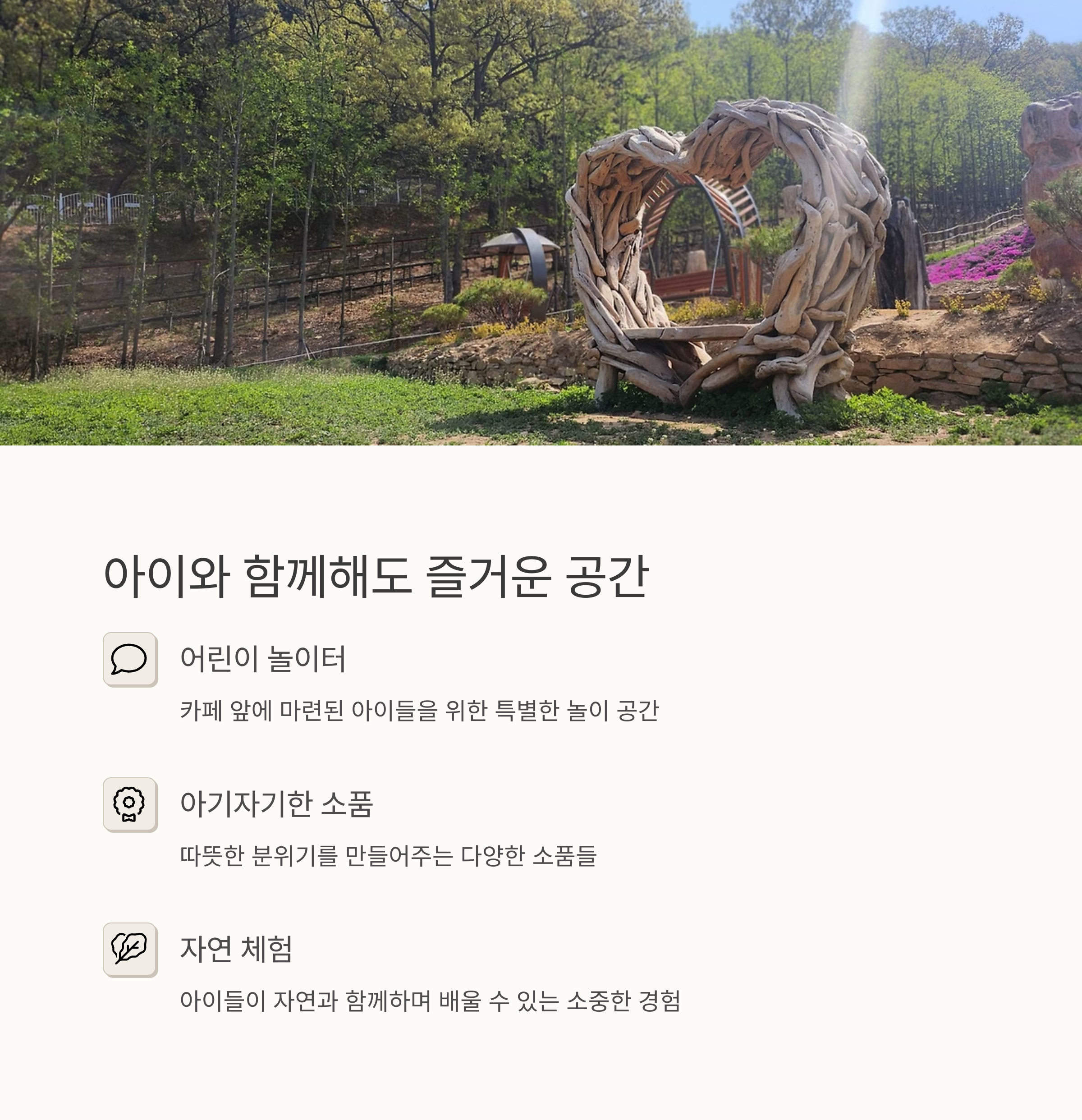 | 감성 카페 공간 | 통창, 해먹, 캠핑 의자, 반려견 동반 등 다양한 감성 요소 제공 |