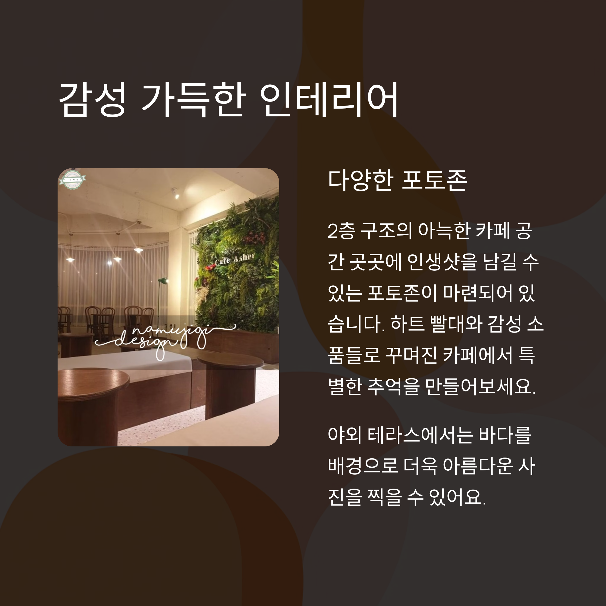 메뉴도 감성 가득한 구성으로 꾸며져 있습니다. 수제 와플, 하트 빨대가 꽂힌 음료, 생과일 주스, 라떼 등 맛과 비주얼을 모두 챙긴 디저트류가 준비되어 있으며, 카페 곳곳에 사진 명소로 유명한 감성 포토존이 마련되어 있어 족욕 후 데이트 인증샷이나 여행 인생샷을 남기기에 제격입니다. 실내 좌석 간 간격도 넓고, 분위기가 조용해 혼자만의 힐링 시간을 보내기에도 좋습니다.