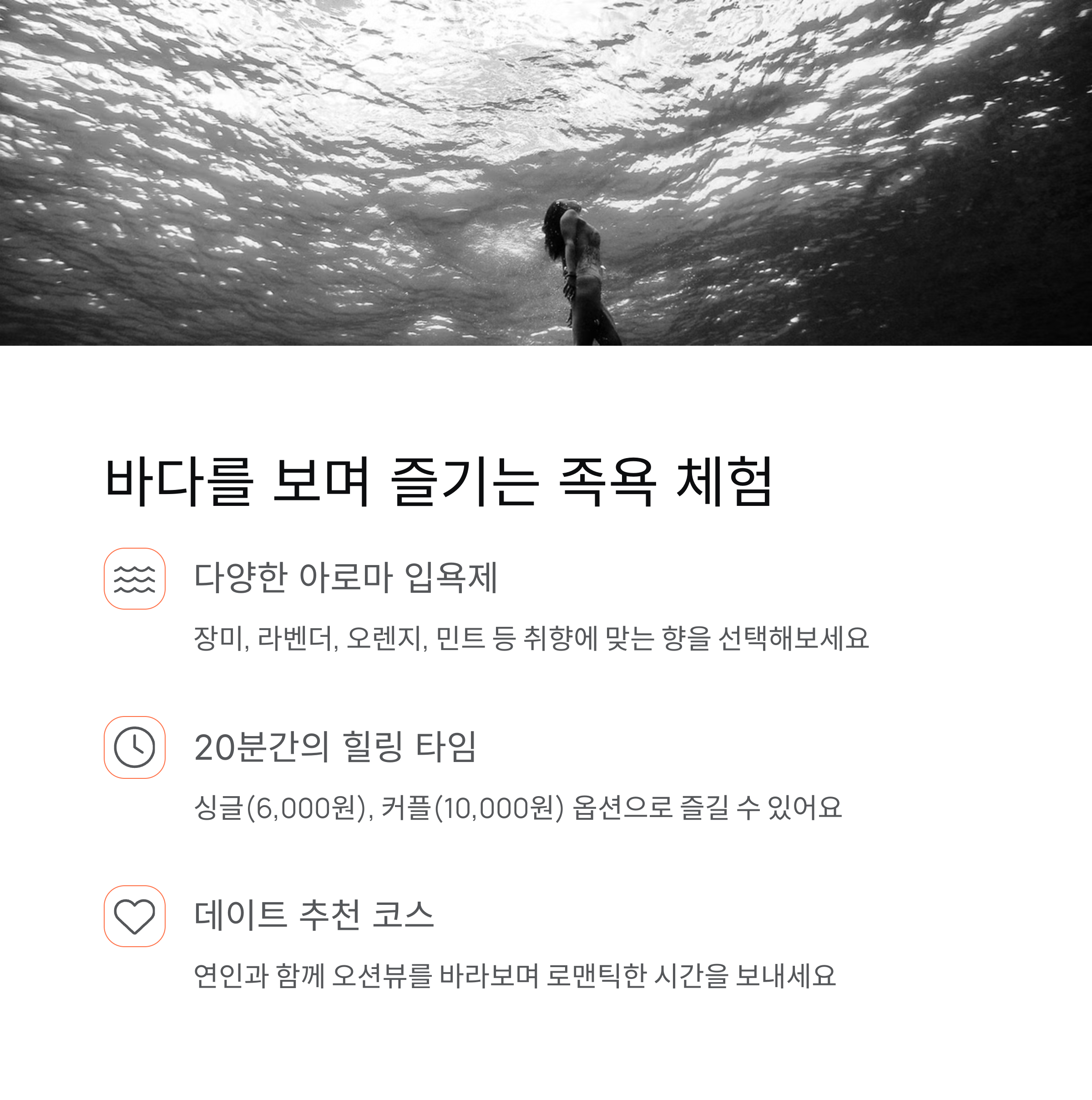 | 오션뷰 족욕 카페 | 라벤더, 장미, 민트 등 선택 가능한 입욕제와 바다 풍경 족욕 체험 |