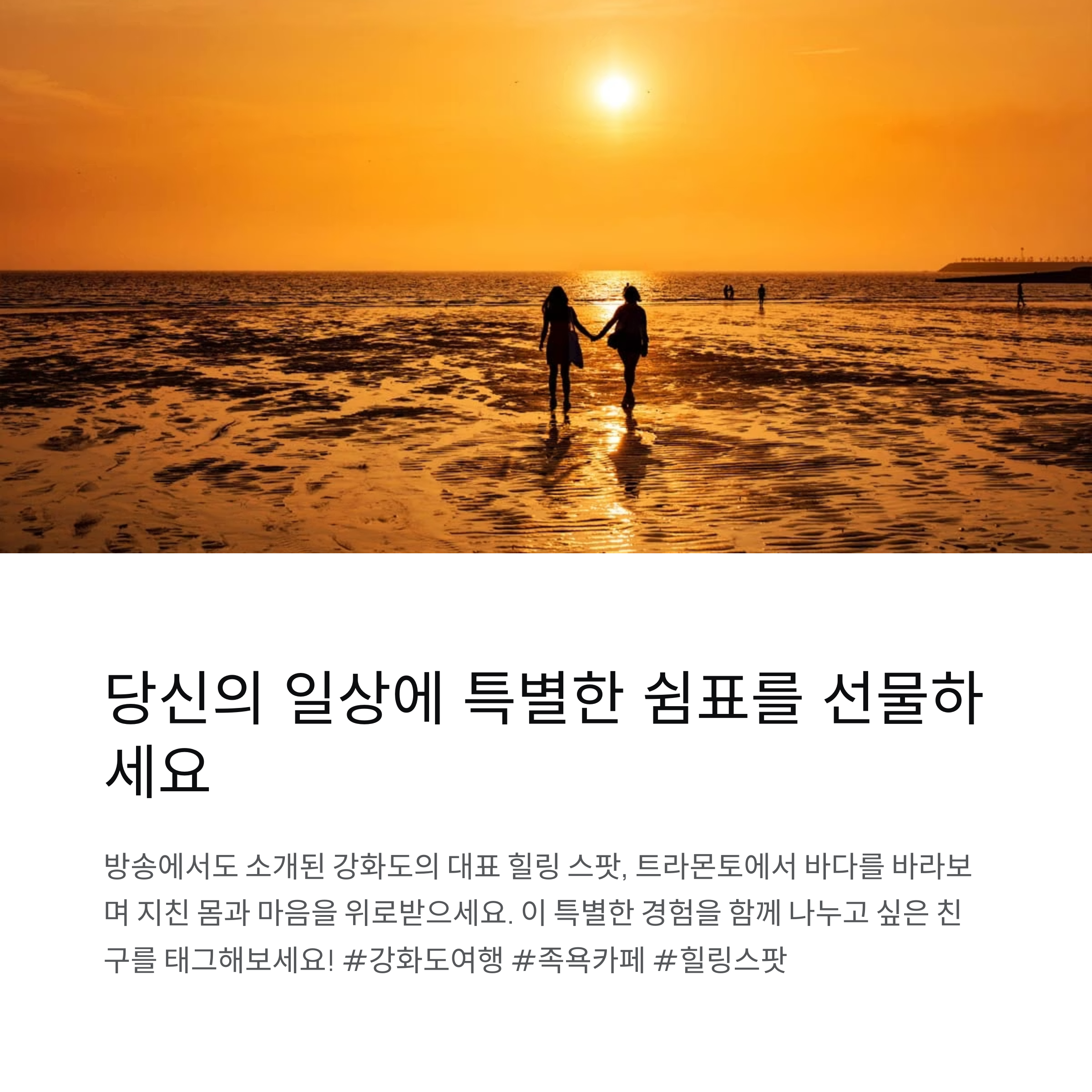 강화도에서 바다 보며 힐링하고 싶다면 단연 추천되는 장소, 오션뷰 족욕 카페 트라몬토를 소개합니다. 언덕 위에 자리잡아 1층, 2층, 야외 테라스까지 탁 트인 바다 전망을 자랑하며, 카페 내 족욕 공간에서는 라벤더, 장미, 오렌지, 민트 등 다양한 입욕제를 선택해 감성 족욕 체험을 즐길 수 있어 큰 인기를 끌고 있습니다. 감성 포토존, 소품, 하트 빨대 등 카페 곳곳에서 데이트, 가족 나들이, 감성 여행을 위한 완벽한 분위기를 선사하는 강화도 대표 힐링 명소입니다.