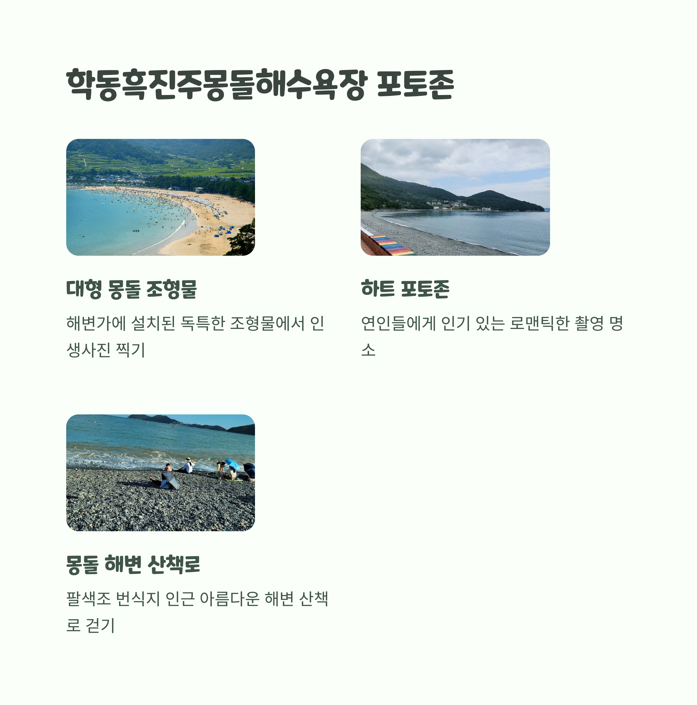 사진 찍기 좋은 명소도 다양합니다. 몽돌해변 대형 몽돌 조형물과 하트 포토존, 해변 산책로에서 바라보는 수평선, 파도 모양의 버스정류장, 바람의 언덕 풍차와 목재 전망대, 신선대 바위 군락과 다도해 일몰 뷰 등 곳곳이 포토 스팟이자 힐링 포인트로 가득해요.
