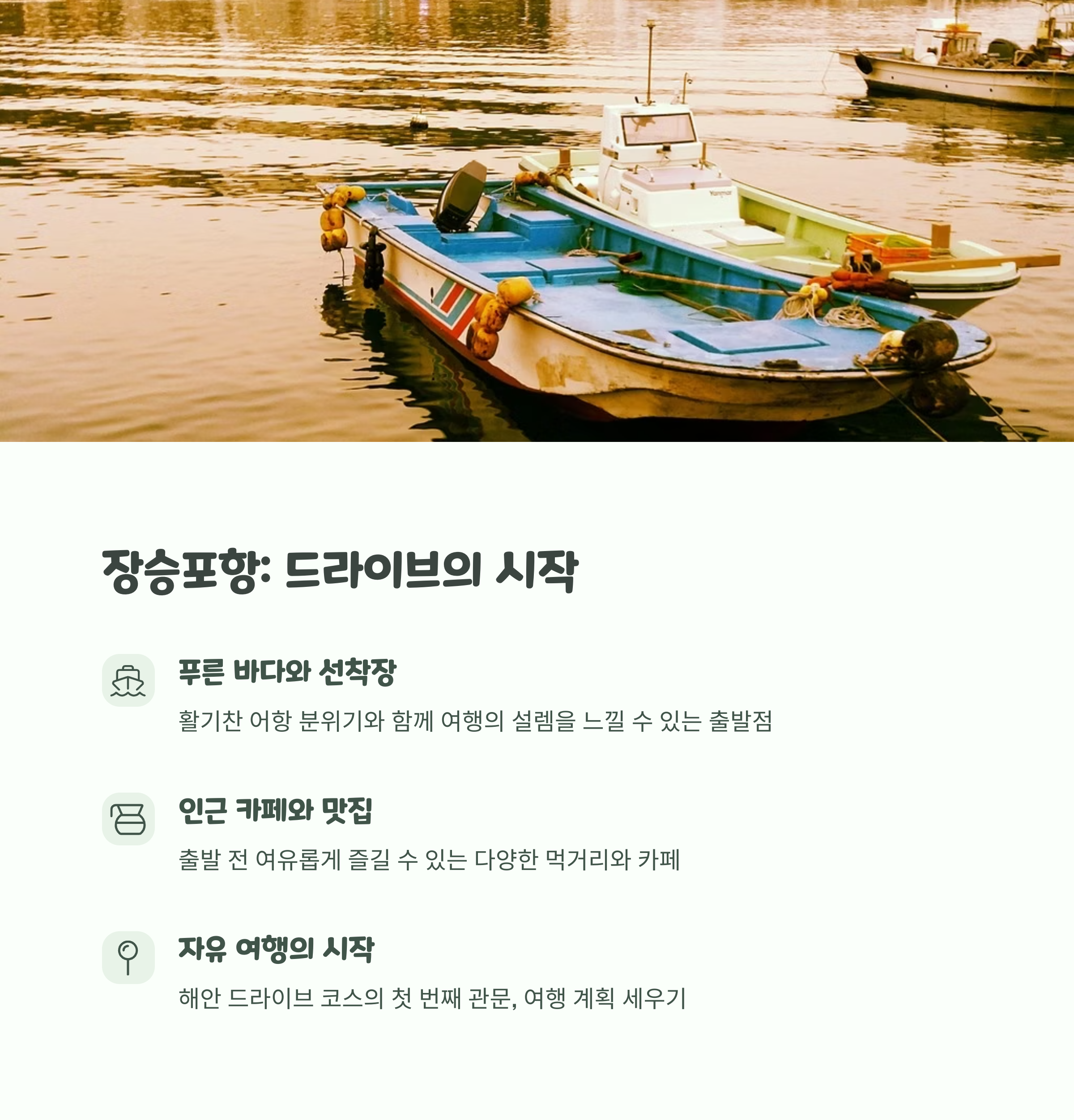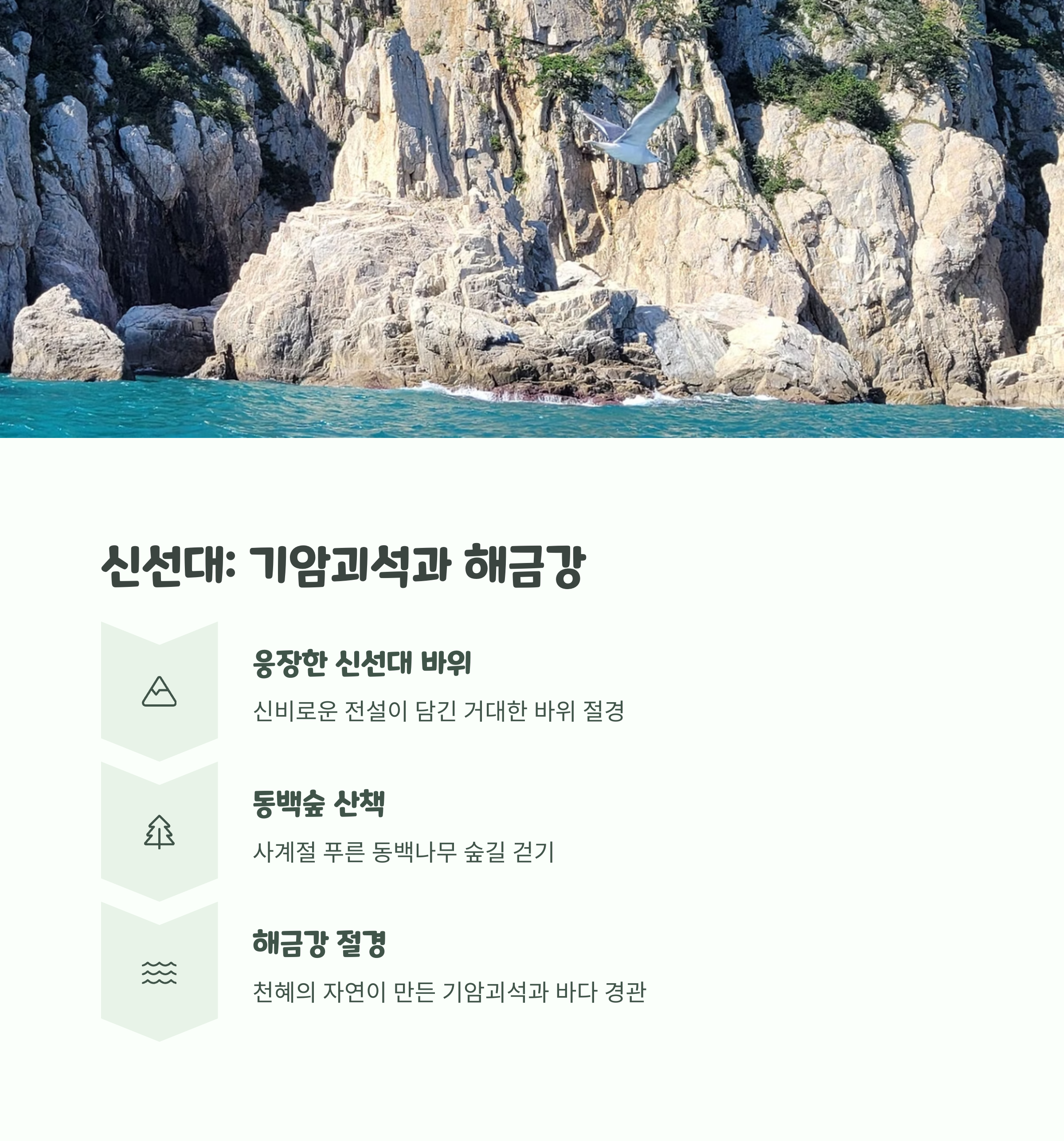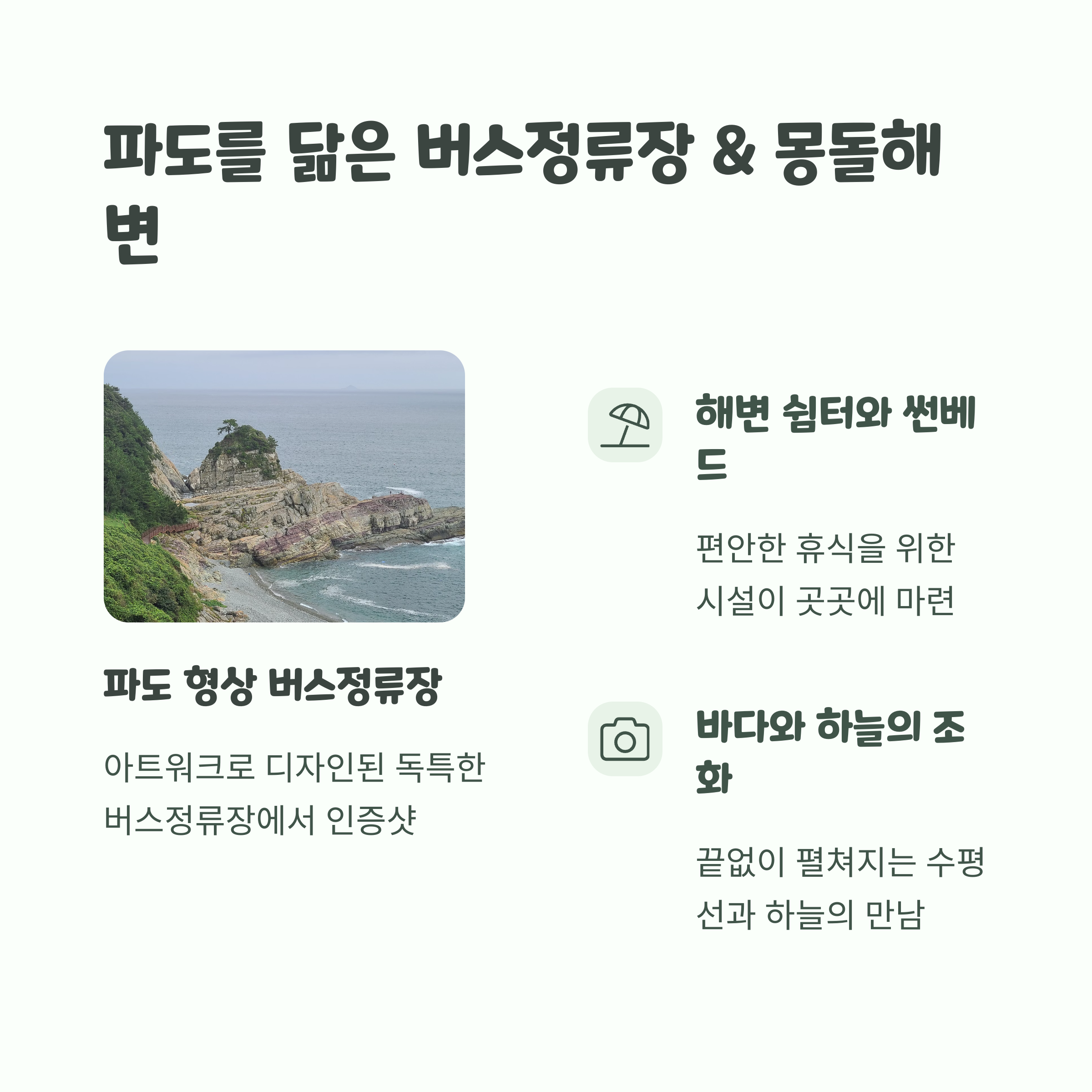 | 추천 교통 수단 | 자가용 또는 렌트카 이용 시 자유로운 이동 가능, 해안 포인트별 정차 쉬움 |