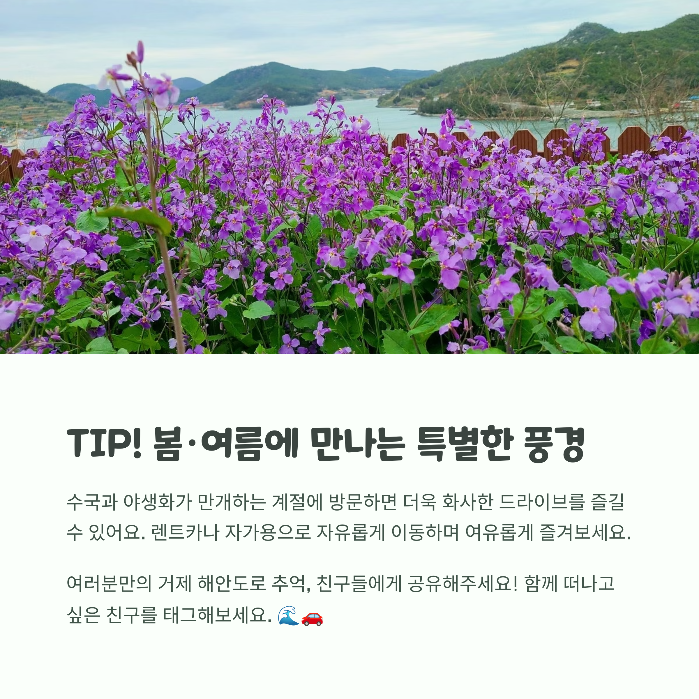 거제 몽돌해변 해안도로 드라이브는 바다, 꽃, 자연이 어우러진 최고의 힐링 코스입니다. 여유롭게 달리고, 사진 찍고, 파도 소리에 귀 기울이는 자유로운 여행의 매력을 느껴보세요!