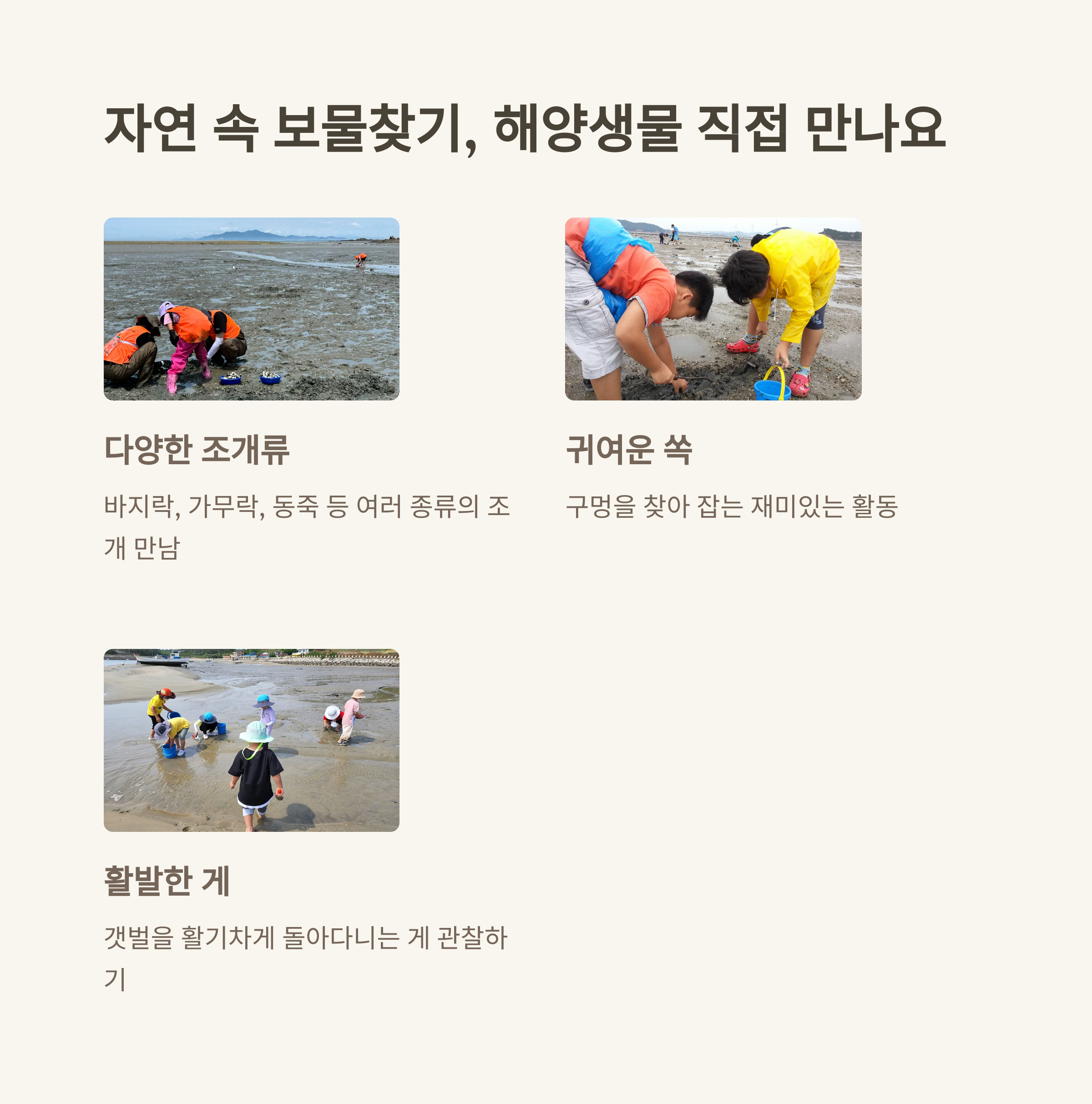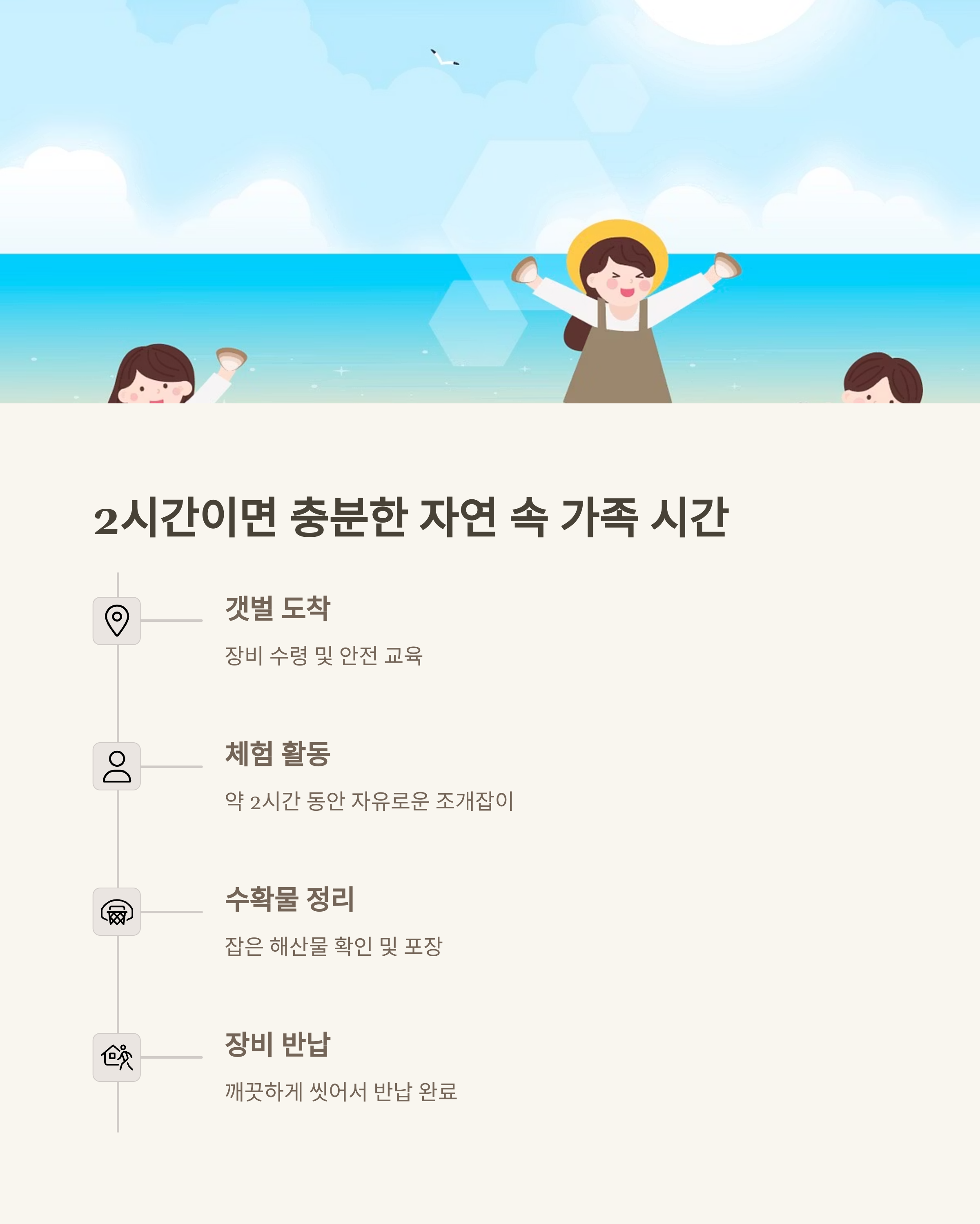 체험 시간은 약 2시간으로 넉넉하게 주어지며, 조개가 많이 나오는 지점을 현장 스태프가 친절히 안내해줘서 처음 오는 사람도 쉽게 재미를 느낄 수 있어요.