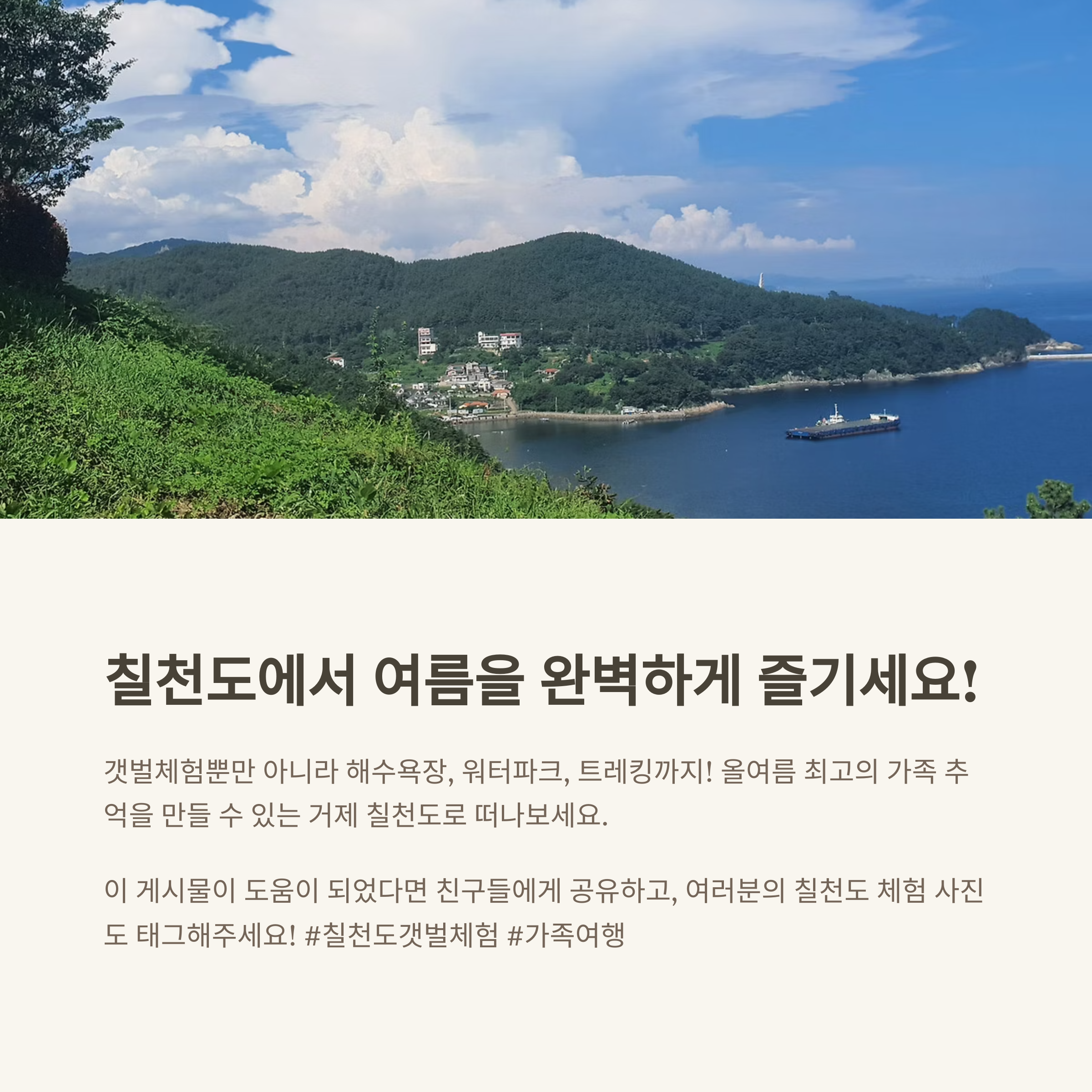 칠천도 외에도 가족과 함께 다녀온 인상 깊은 체험지를 댓글로 공유해주세요. 다른 가족 여행자들에게 유익한 정보가 될 수 있어요!