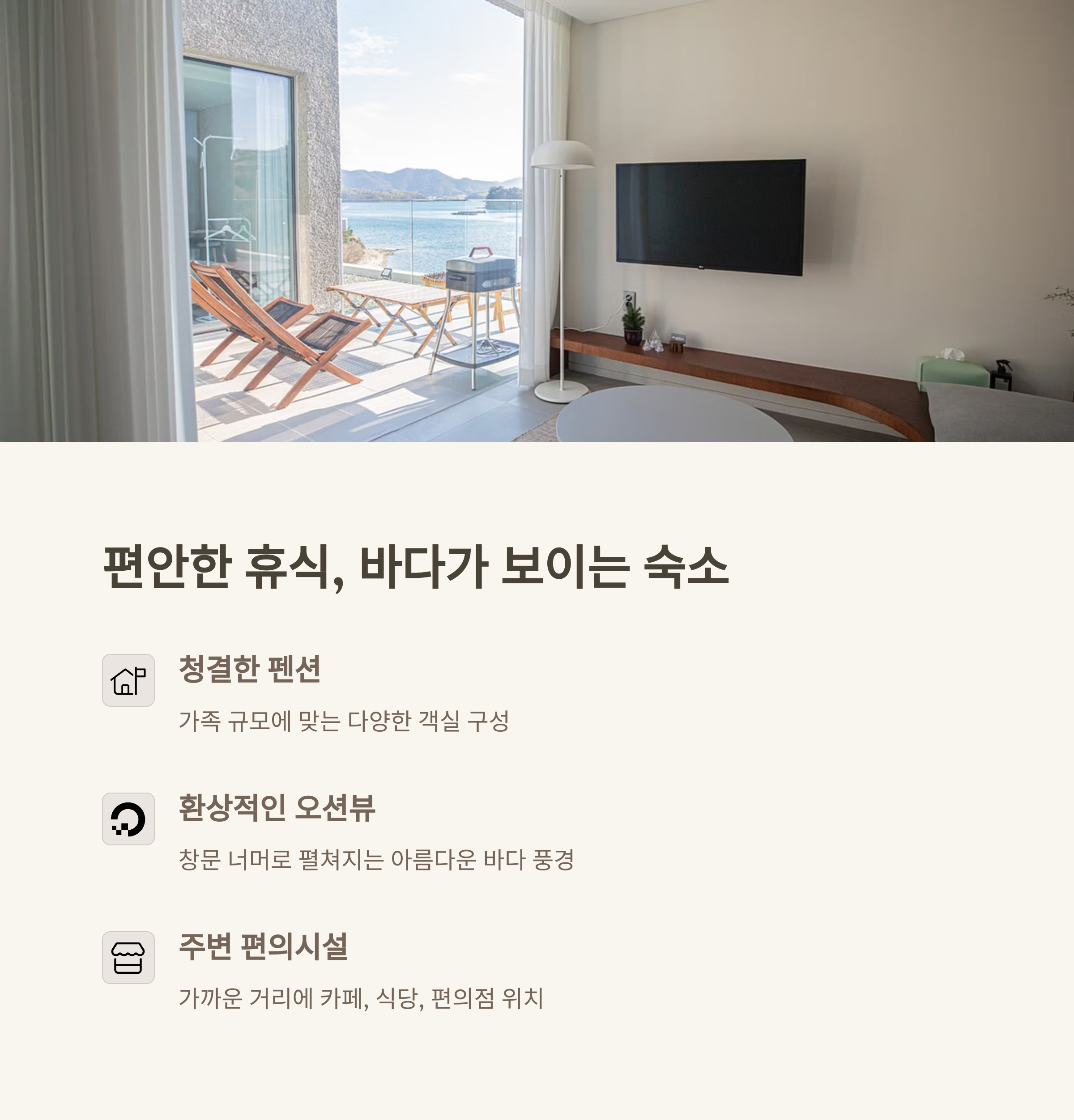 ● 인근 펜션: 바다 뷰, 깔끔한 시설, 친절한 운영으로 가족 단위 숙소로 인기