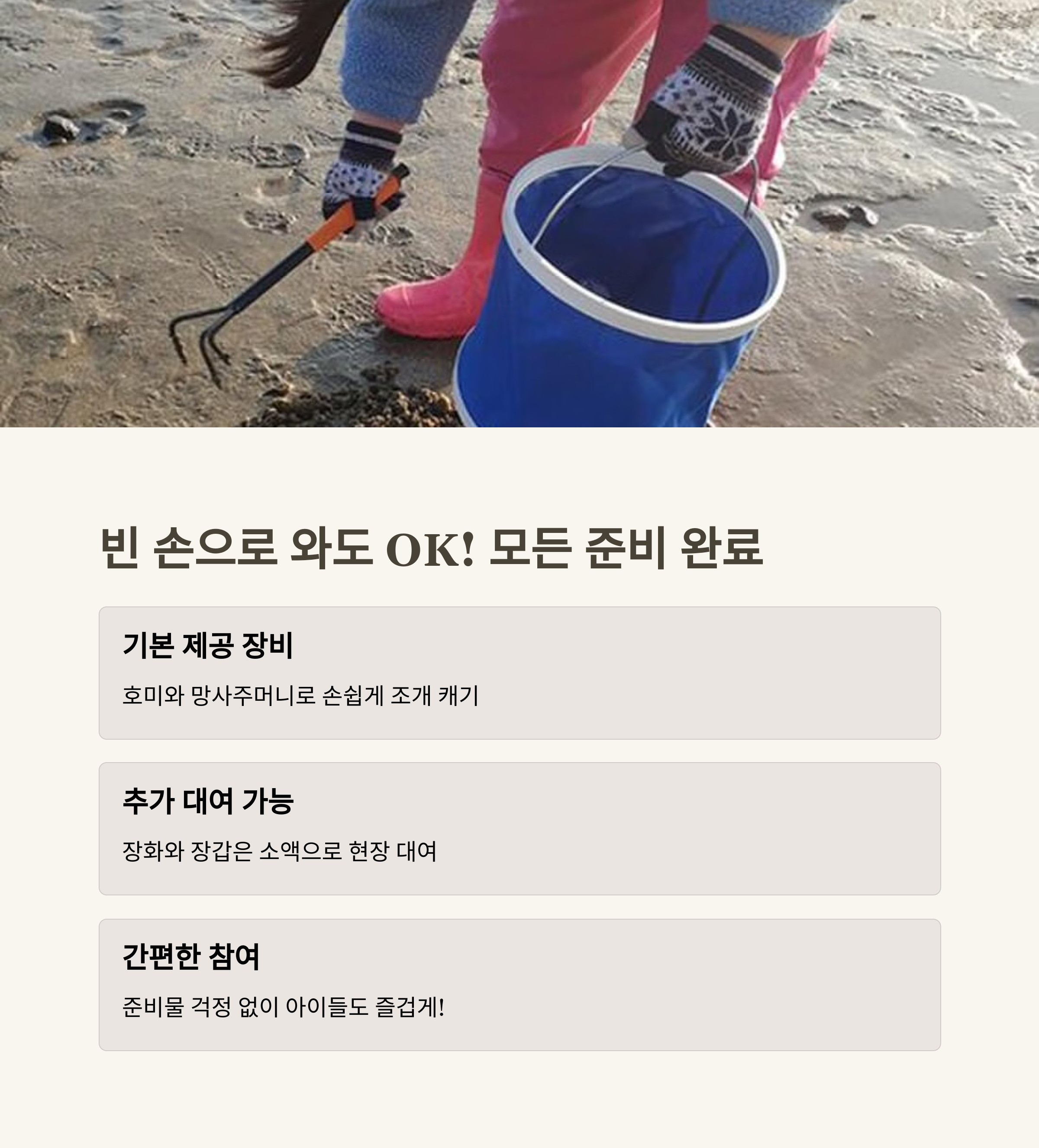 체험 후에는 장비를 깨끗하게 씻어 반납하고 근처 샤워시설이나 간이 세척장에서 옷과 장화를 정리하면 마무리! 아이들은 물론 어른들도 시간 가는 줄 모르고 즐기는 갯벌 체험이었습니다.