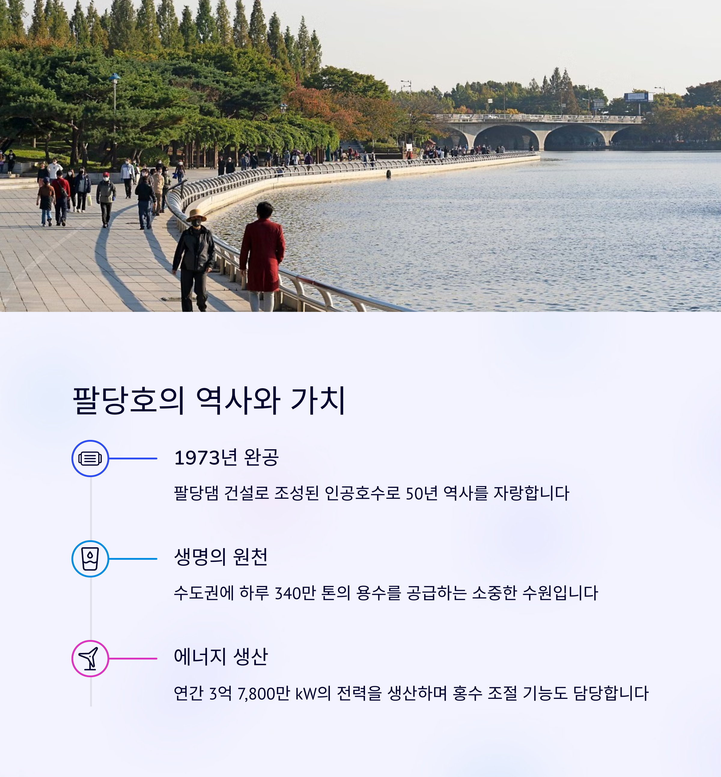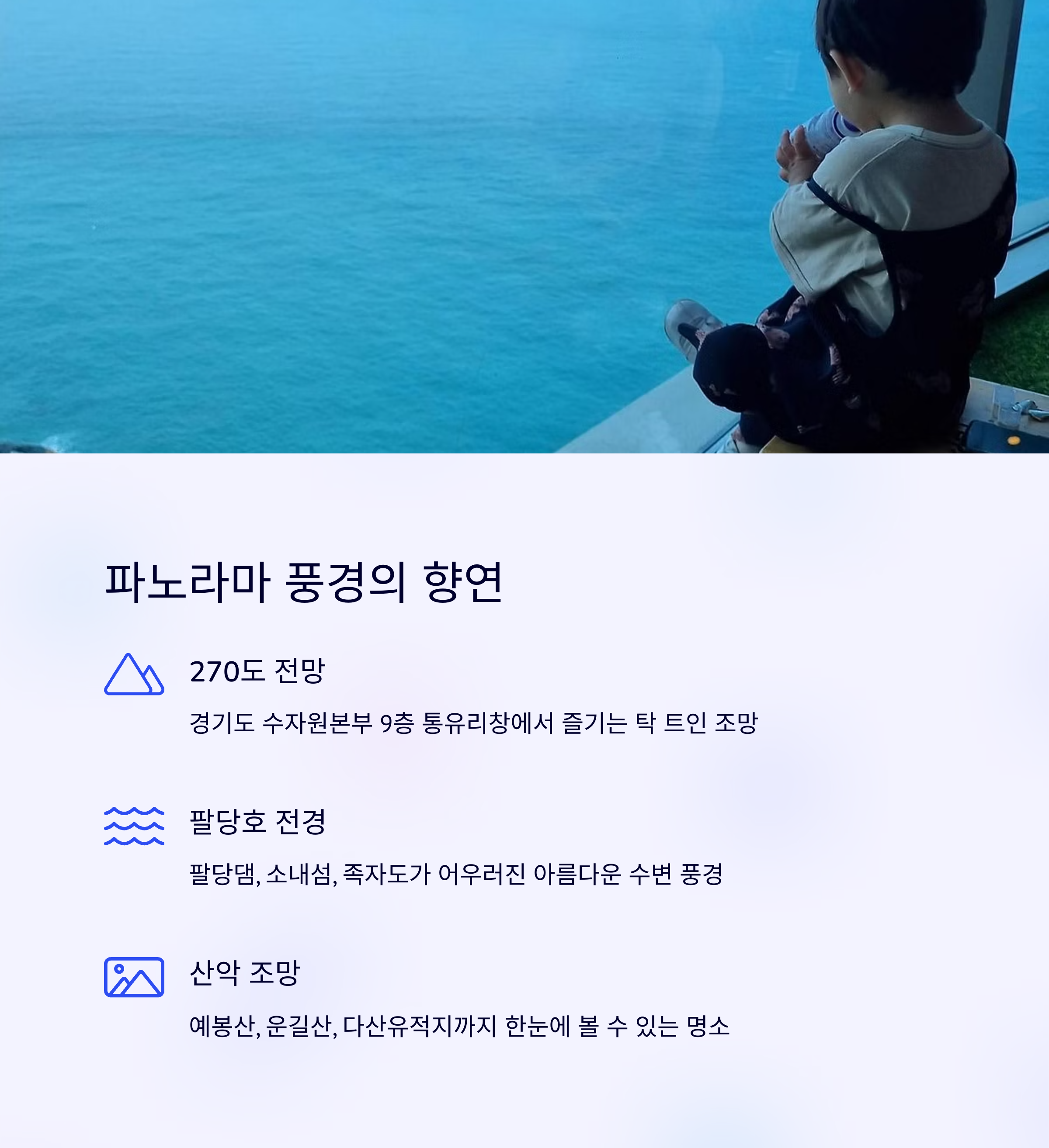 | 호수·산·하늘이 어우러진 감성 일몰 | 수자원본부 9층, 09시~18시 무료 개방 | 팔당 드라이브 후 일몰 감상 코스로 적합 |