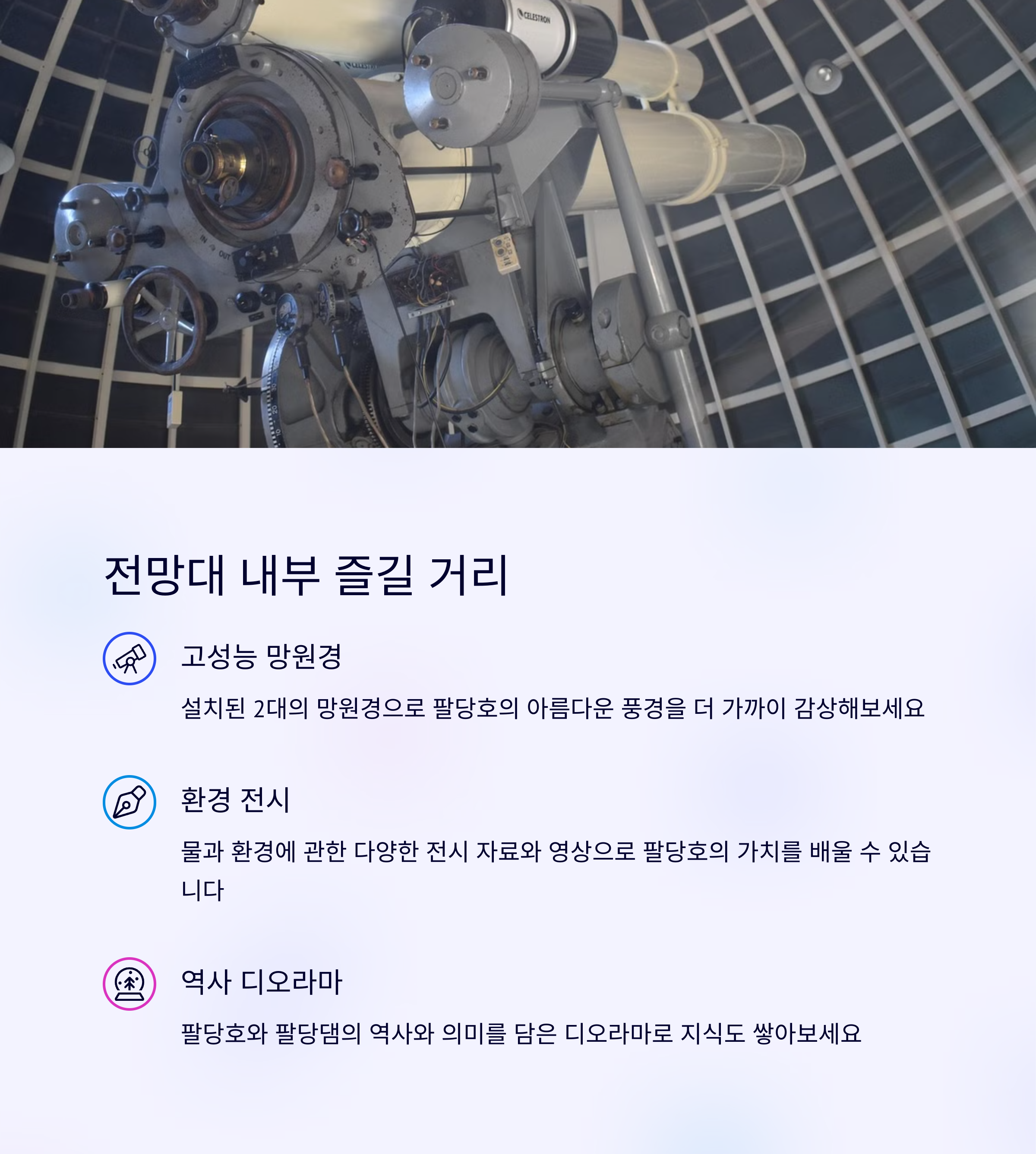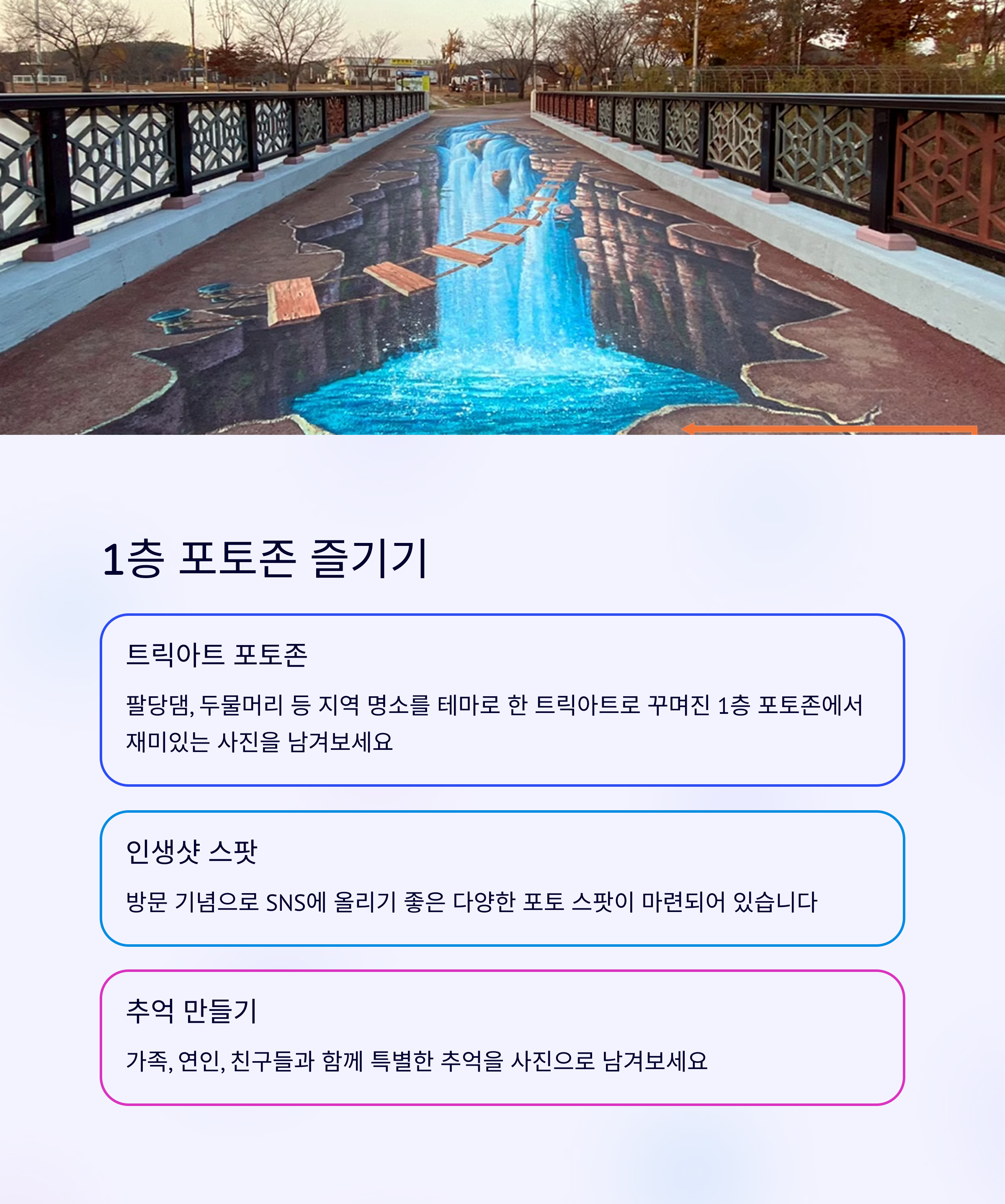전망대는 건물 뒤편의 무료 주차장을 이용하면 바로 접근할 수 있어 차량 이용객에게 매우 편리합니다. 전체적으로 조용하고 쾌적한 분위기라 가족 단위 방문객은 물론, 혼자만의 시간을 보내기에도 안성맞춤입니다. 팔당호 드라이브 후 일몰 포인트로 마무리하기 좋으며, 단순한 전경 감상 이상의 감성 힐링이 가능한 소중한 뷰 포인트입니다.