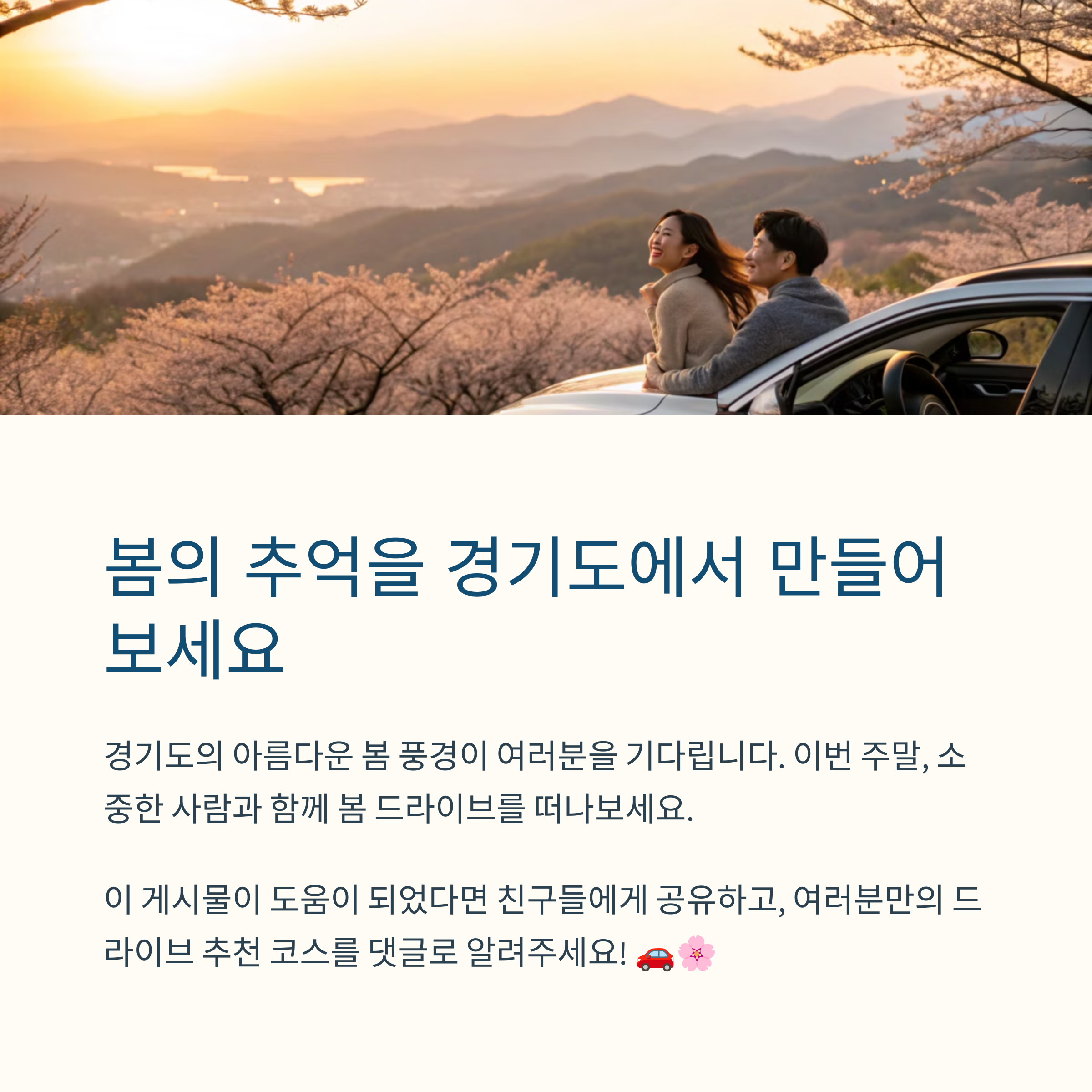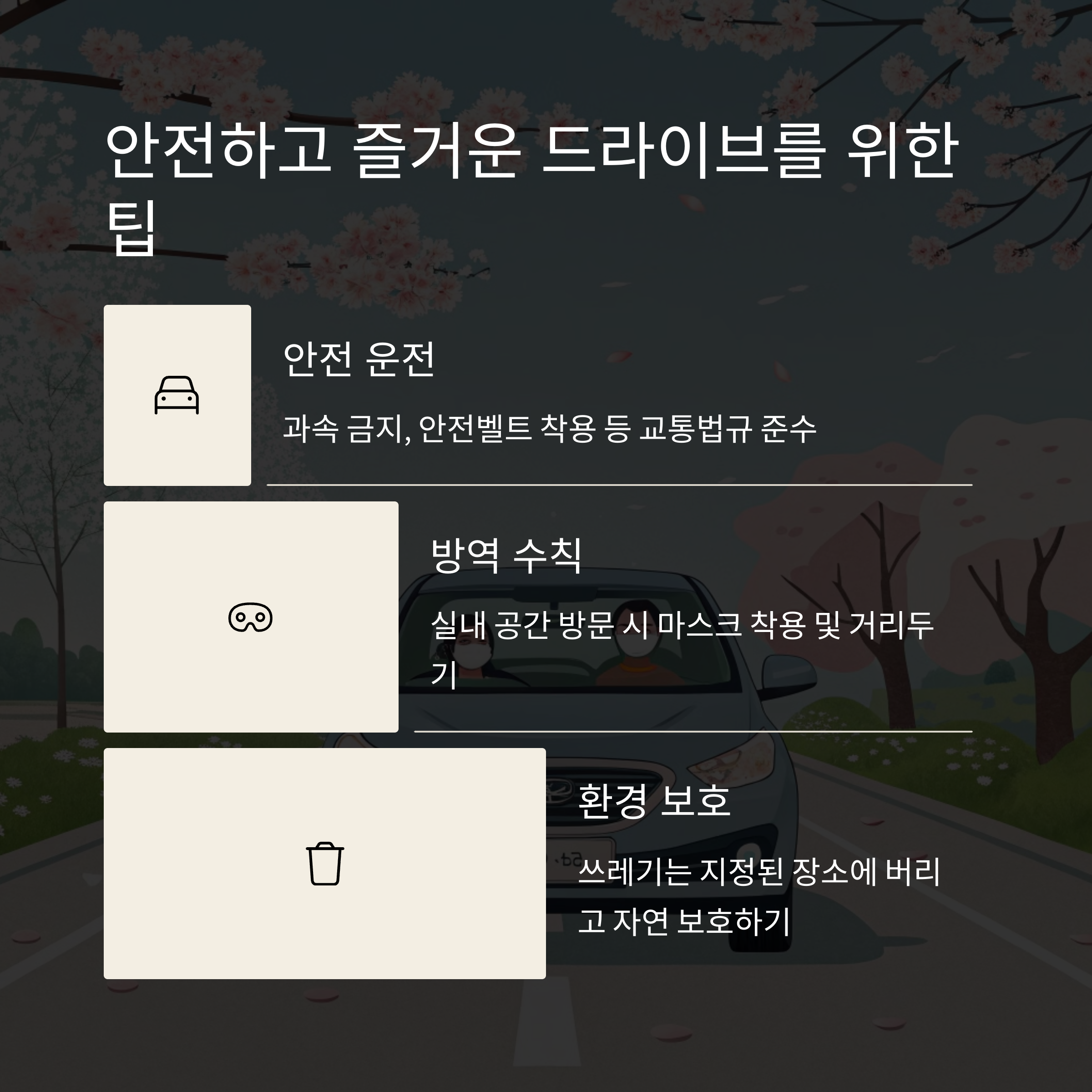 여러분이 추천하는 **봄철 드라이브 코스**가 있나요? 또는 방문해 본 장소 중 인상 깊었던 곳이 있다면 댓글로 공유해 주세요! 소중한 경험을 나누어 함께 더 많은 분들께 유익한 정보를 제공해요 😊