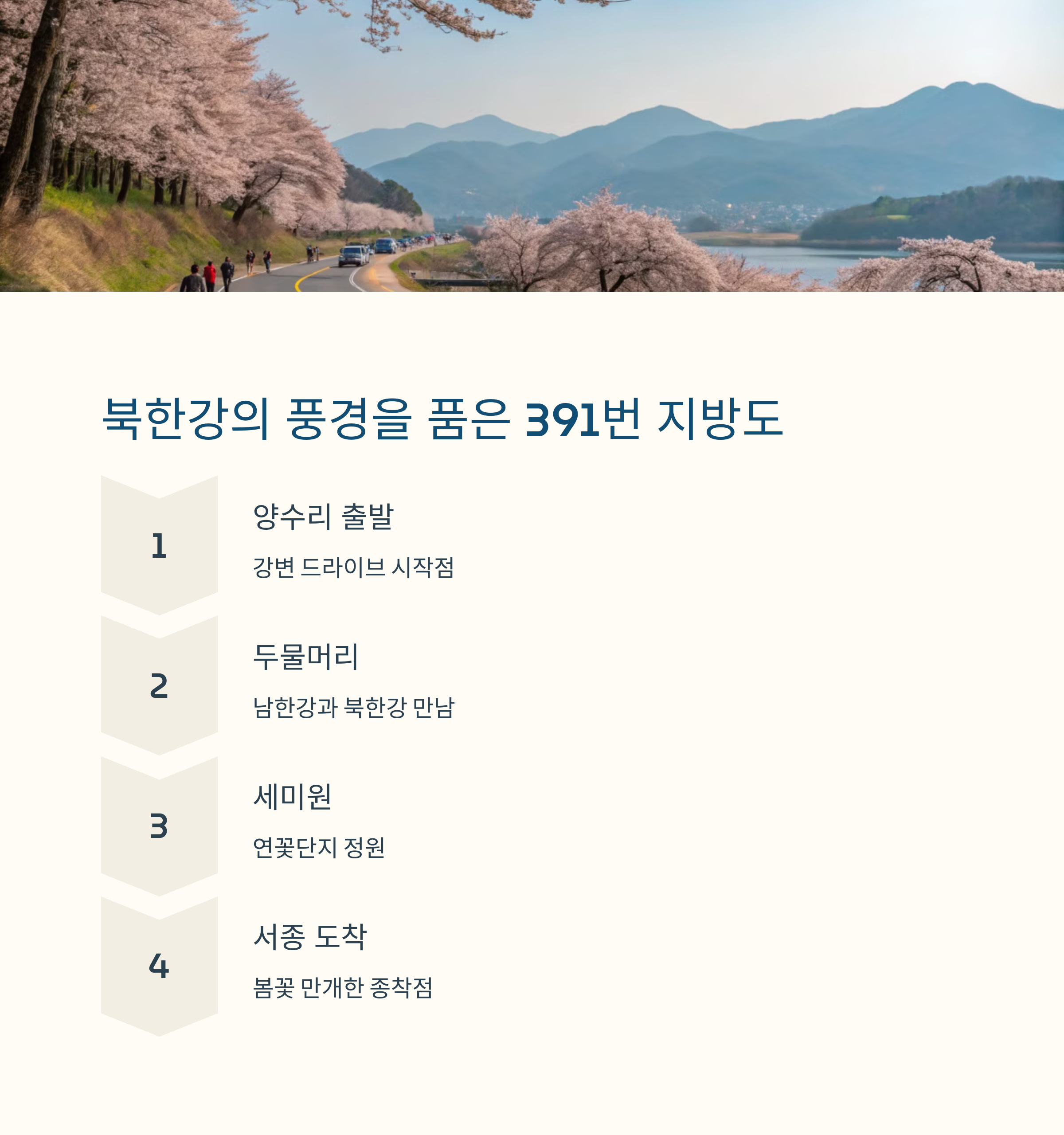 **양평 두물머리 인근 391번 지방도**를 따라 달리면, 벚꽃이 도로 양옆으로 만개해 환상적인 드라이브 코스를 제공합니다. 특히 아침 시간대 방문하면 더 운치 있는 분위기를 느낄 수 있어요.
