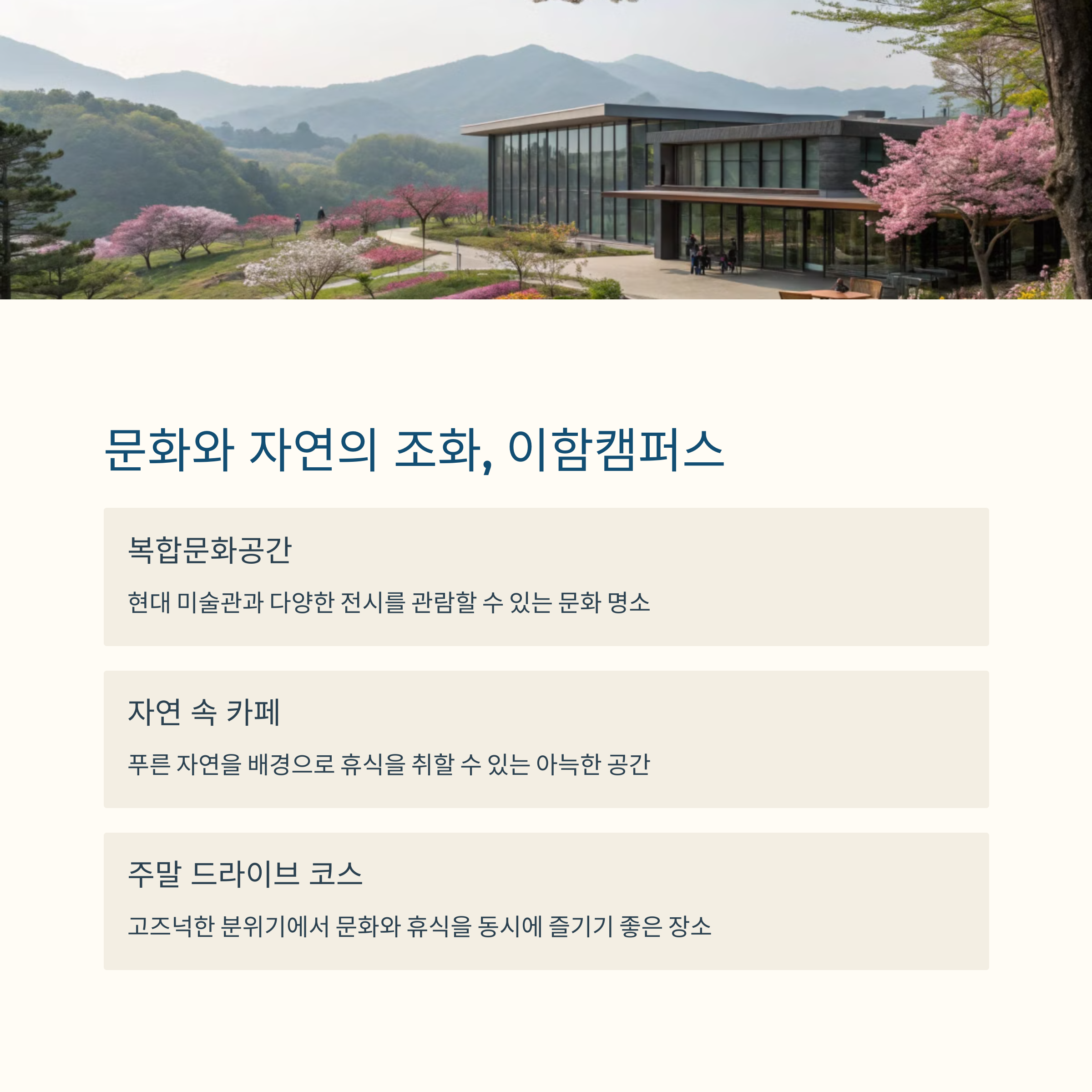 **이함캠퍼스**는 미술관과 카페, 공방이 함께 있는 복합문화공간입니다. 드라이브 중 잠시 들러 여유로운 시간을 보낼 수 있으며, 감각적인 인테리어와 전시를 감상할 수 있어 인스타 감성에도 딱 맞아요!