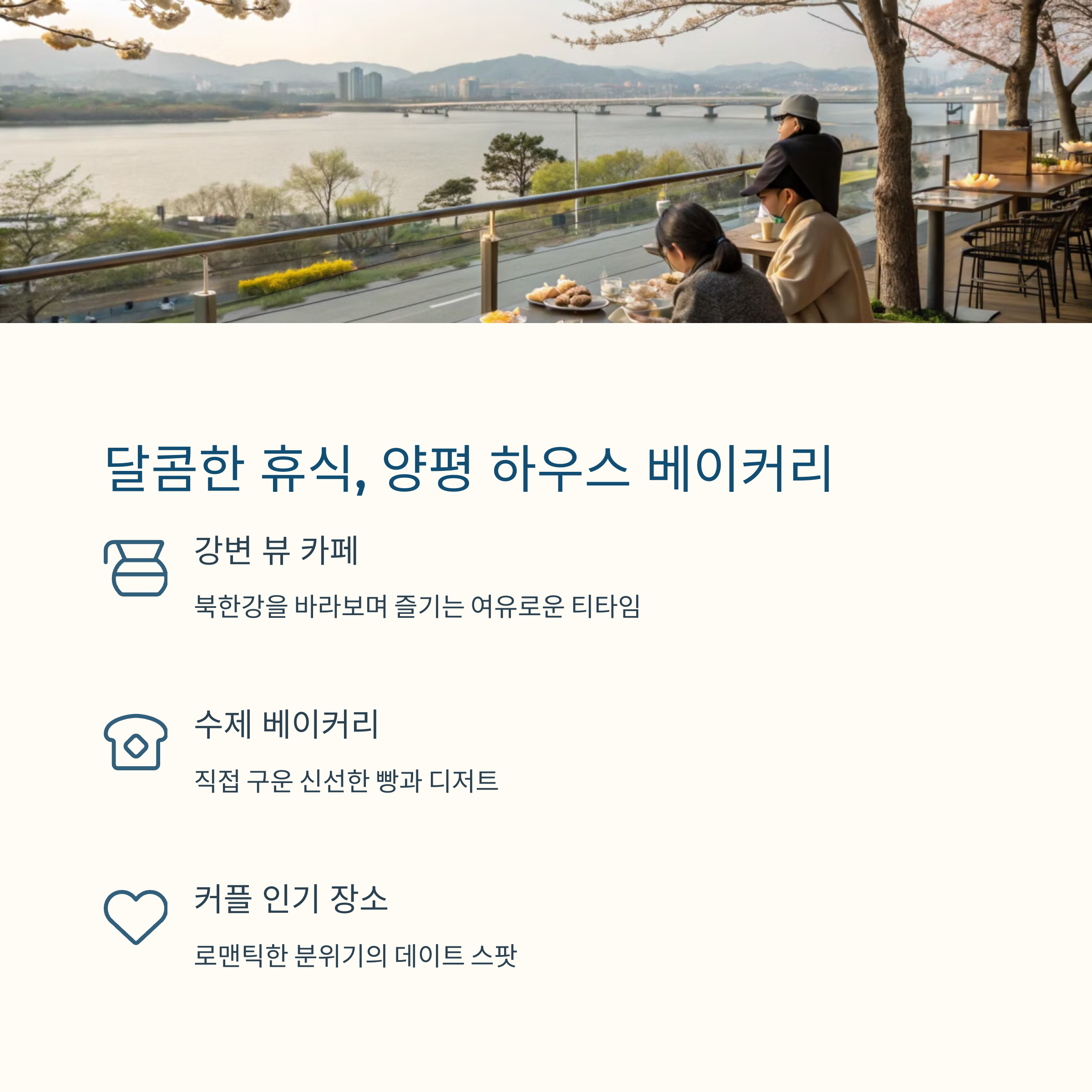 가평의 ‘쁘띠 프랑스’ 근처에 위치한 **리버뷰 카페**를 추천합니다. 북한강이 한눈에 보이는 멋진 전망을 자랑하며, **봄철에는 벚꽃과 함께 여유로운 커피 한잔을 즐기기에 제격**입니다.
