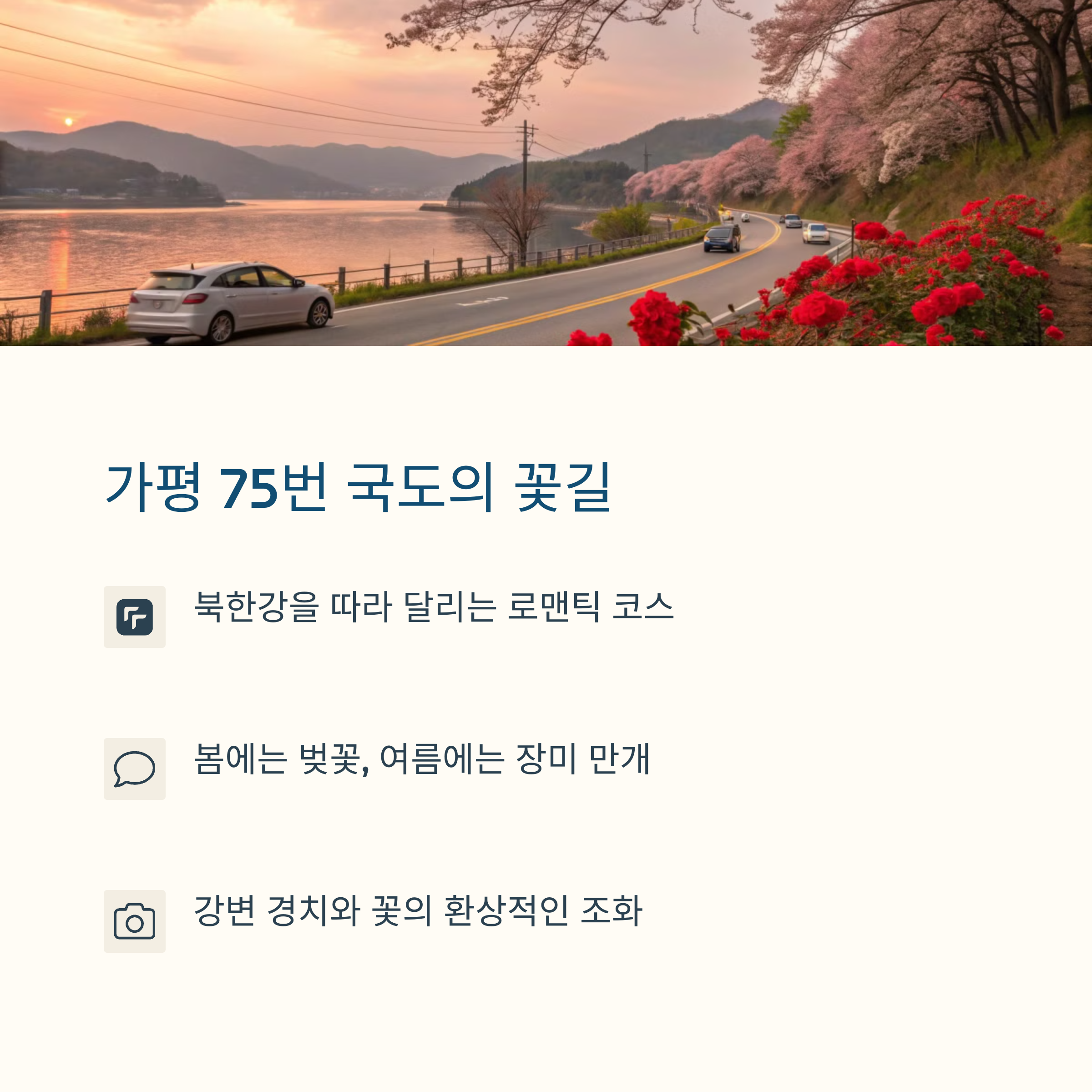 따뜻한 봄바람이 불어오면 자연스럽게 드라이브를 떠나고 싶은 계절이 다가옵니다. 경기도는 사계절 내내 아름다운 풍경을 자랑하지만, 특히 **봄철 벚꽃이 만개한 도로를 따라 달리는 드라이브 코스**는 놓칠 수 없는 즐거움입니다. 이번 글에서는 **가평, 양평, 이천** 지역에서 **가장 아름다운 드라이브 코스**와 **추천 명소**를 소개해 드릴게요. **북한강을 따라 벚꽃을 감상하며 달릴 수 있는 로맨틱한 가평, 감성적인 강변 드라이브가 매력적인 양평, 그리고 자연과 어우러진 이천의 숨은 명소까지!** 사랑하는 연인과 함께, 또는 가족, 친구들과 함께 떠나기 좋은 경기도의 **베스트 드라이브 코스**를 만나보세요. 지금부터 추천 코스를 살펴볼까요? 🚗🌸