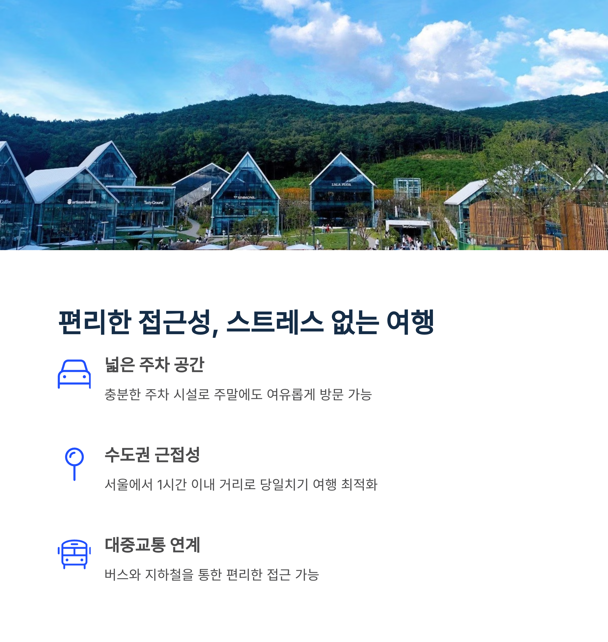 타임빌라스는 수도권 어디서든 차로 30~60분 이내에 도달 가능하여 접근성이 매우 우수합니다. 주차 공간도 넉넉해 주말에도 큰 불편 없이 방문할 수 있으며, 주말 가족 나들이 장소로도 손색이 없습니다. 자연 속에서 힐링하며 트렌디한 쇼핑을 즐기고 싶은 분들에게 완벽한 선택이 될 것입니다.