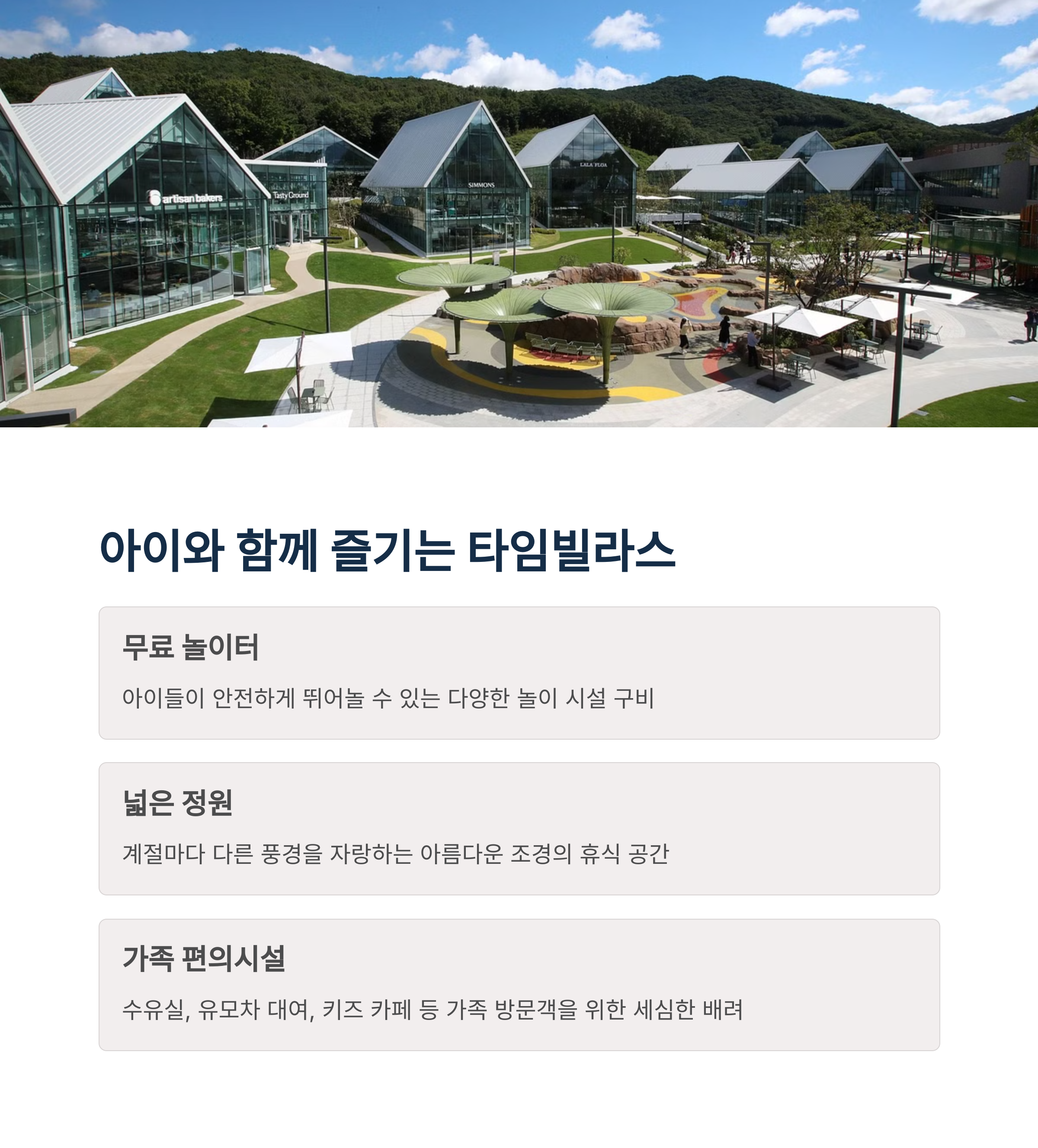 타임빌라스는 수도권 어디서든 차로 30~60분 이내에 도달 가능하여 접근성이 매우 우수합니다. 주차 공간도 넉넉해 주말에도 큰 불편 없이 방문할 수 있으며, 주말 가족 나들이 장소로도 손색이 없습니다. 자연 속에서 힐링하며 트렌디한 쇼핑을 즐기고 싶은 분들에게 완벽한 선택이 될 것입니다.