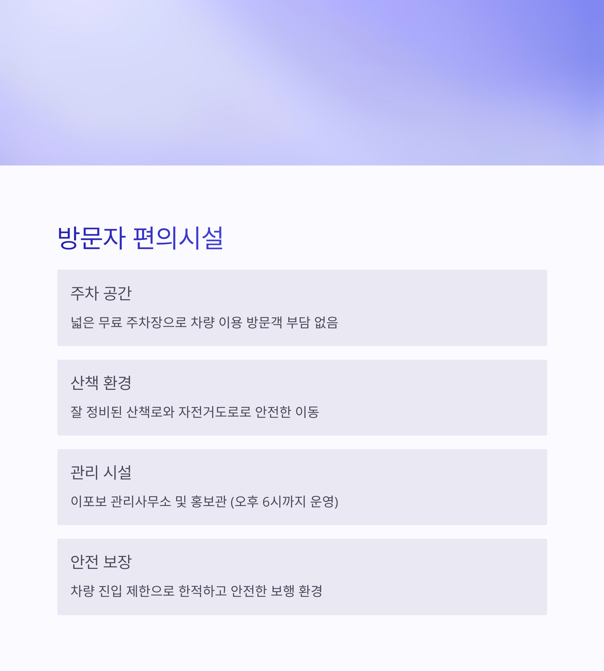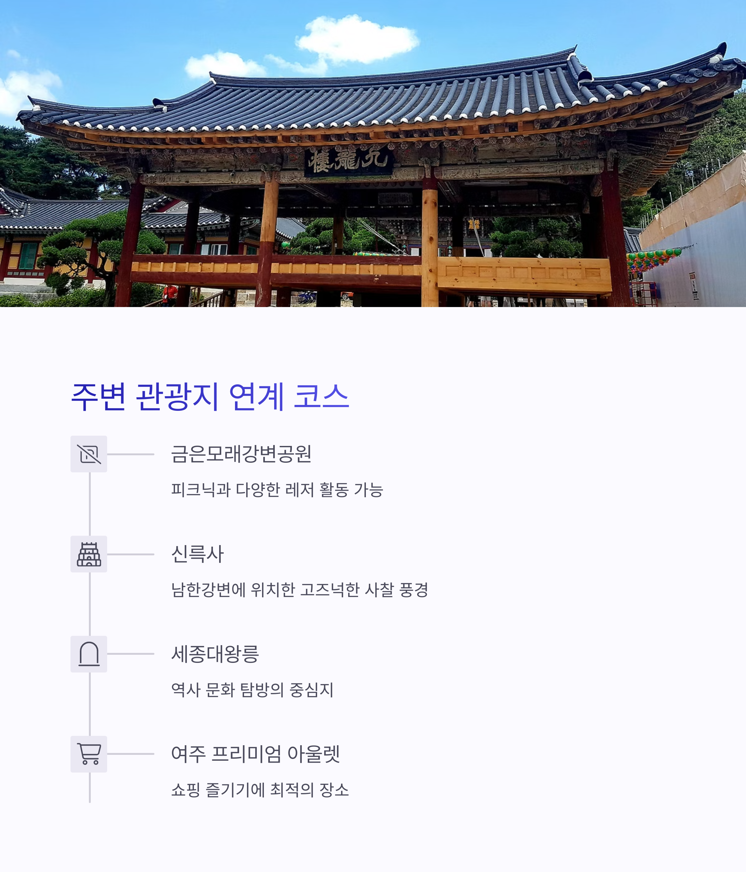 이포보 인근에는 다양한 관광지가 위치해 있어 당일치기 드라이브 코스로도 훌륭한 구성을 자랑합니다. 금은모래강변공원에서 여유로운 산책을 즐기거나, 신륵사와 세종대왕릉 같은 역사 유적지를 방문하는 코스를 함께 계획해 보세요. 남한강의 청량한 바람을 맞으며 걷는 시간은 마음의 여유를 선사하고, 가까운 곳에서의 소소한 여행이 삶에 특별한 기억으로 남게 될 것입니다.
