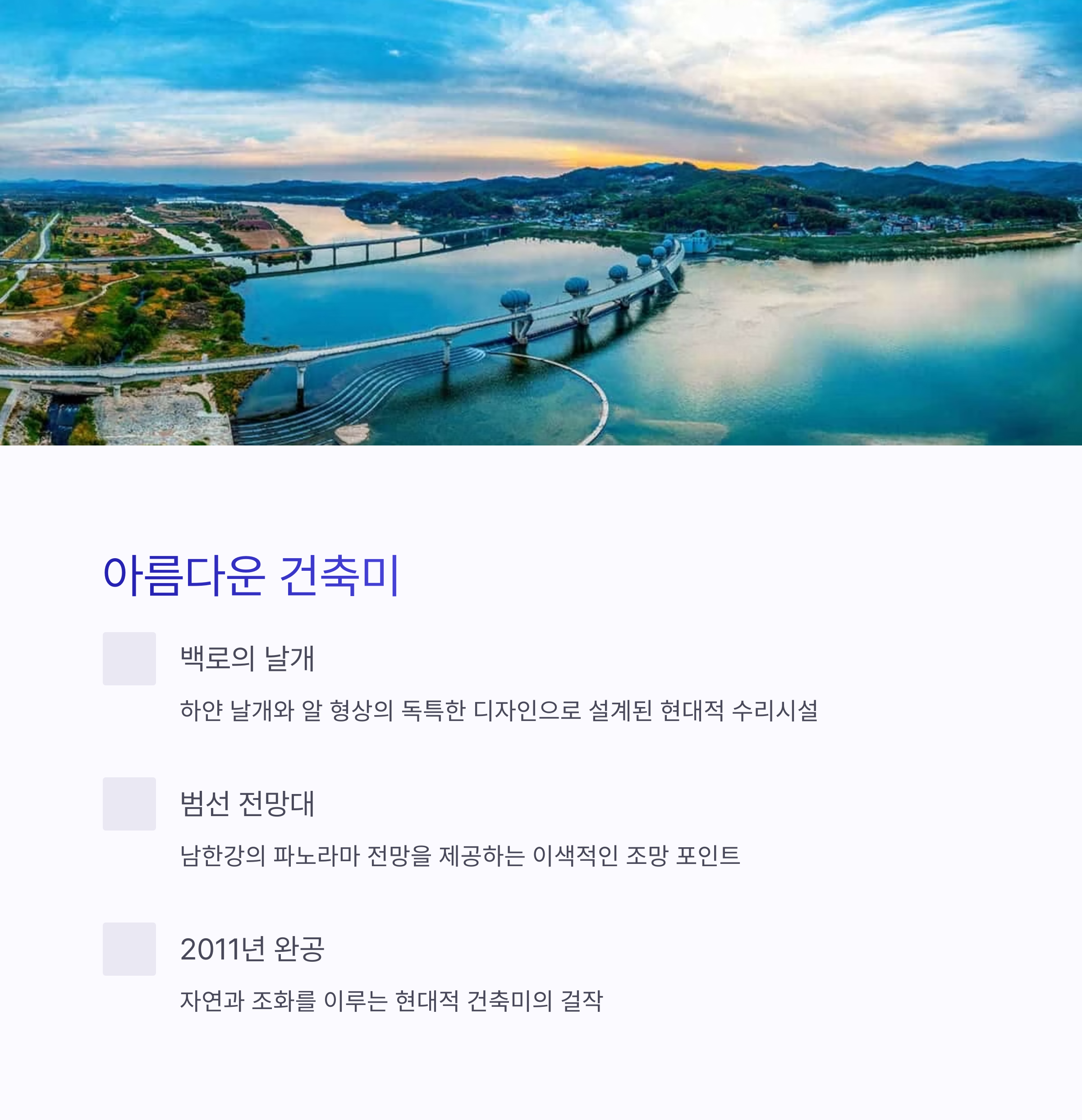 여주 이포보는 남한강을 따라 뻗은 길 위에 자리잡은 대표적인 강변 드라이브 명소입니다. 자연의 곡선을 닮은 이포보는 그 자체로도 예술적인 아름다움을 지니고 있으며, 백로가 날개를 펴는 형상을 본뜬 591m 규모의 보는 여주의 대표적인 상징물로 자리 잡았습니다. 이곳은 계절마다 달라지는 남한강의 풍경을 가장 가까이에서 느낄 수 있는 곳으로, 특히 가을과 봄철에는 드라이브와 산책을 즐기기에 최적의 장소로 손꼽힙니다.
