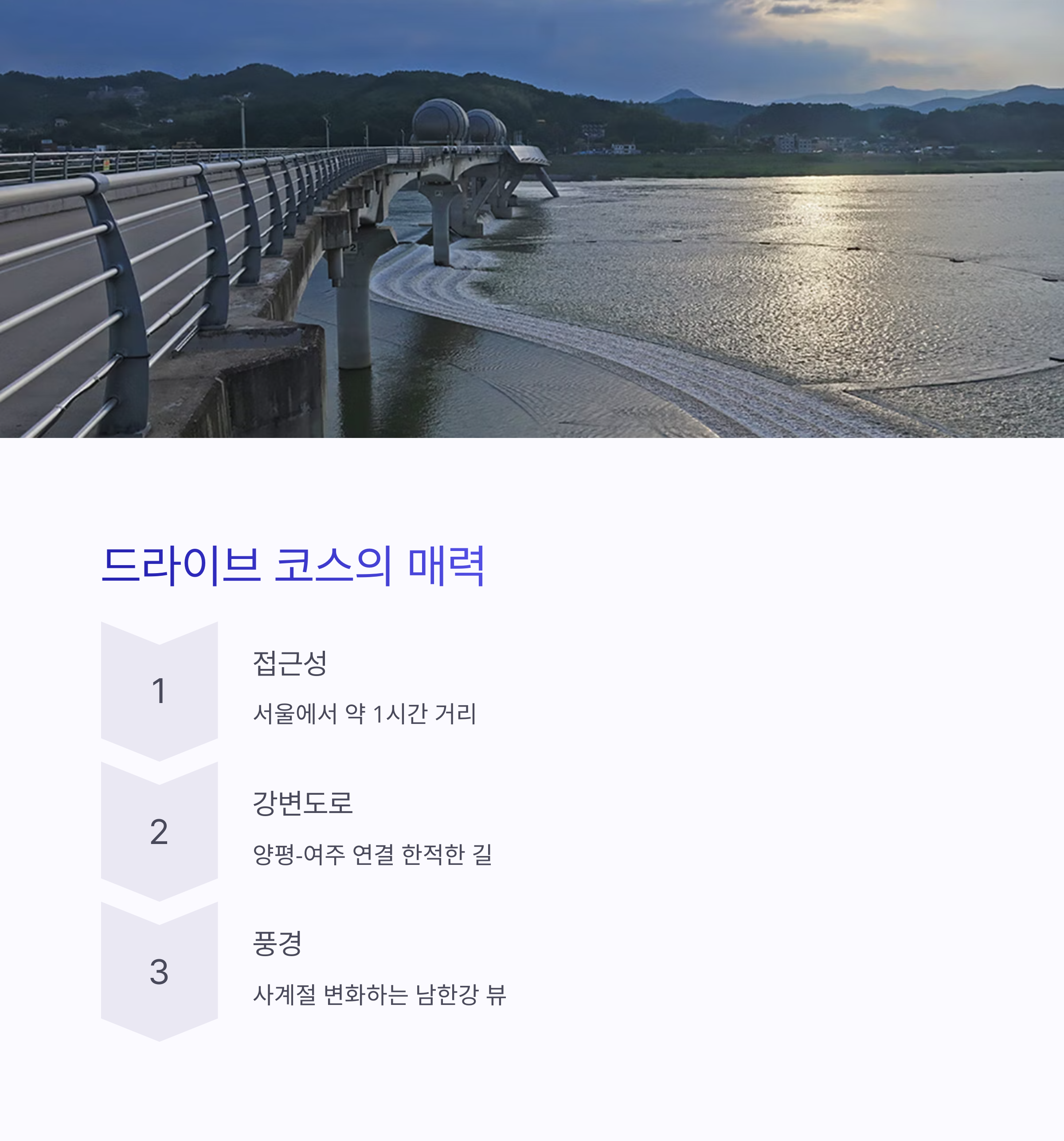 | 남한강 따라 여유로운 드라이브 코스로 인기 | 차량 진입 제한, 도보와 자전거로만 통행 가능 | 신륵사, 금은모래공원 등 관광지와 연계 가능 |