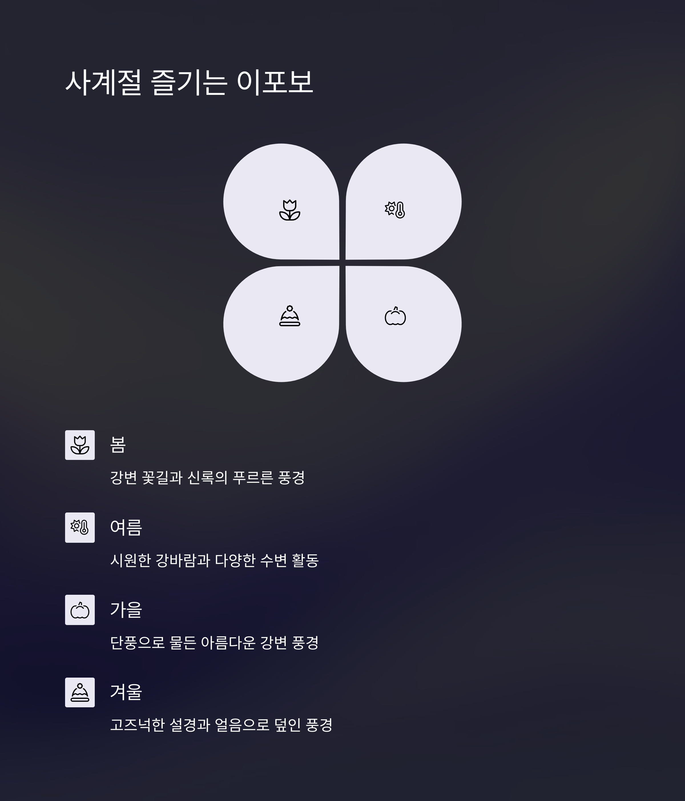 | 사계절 다른 매력의 자연 풍경 제공 | 야경과 일몰 명소로도 손꼽히는 포인트 | 여유로운 하루를 위한 힐링 드라이브 완성 |