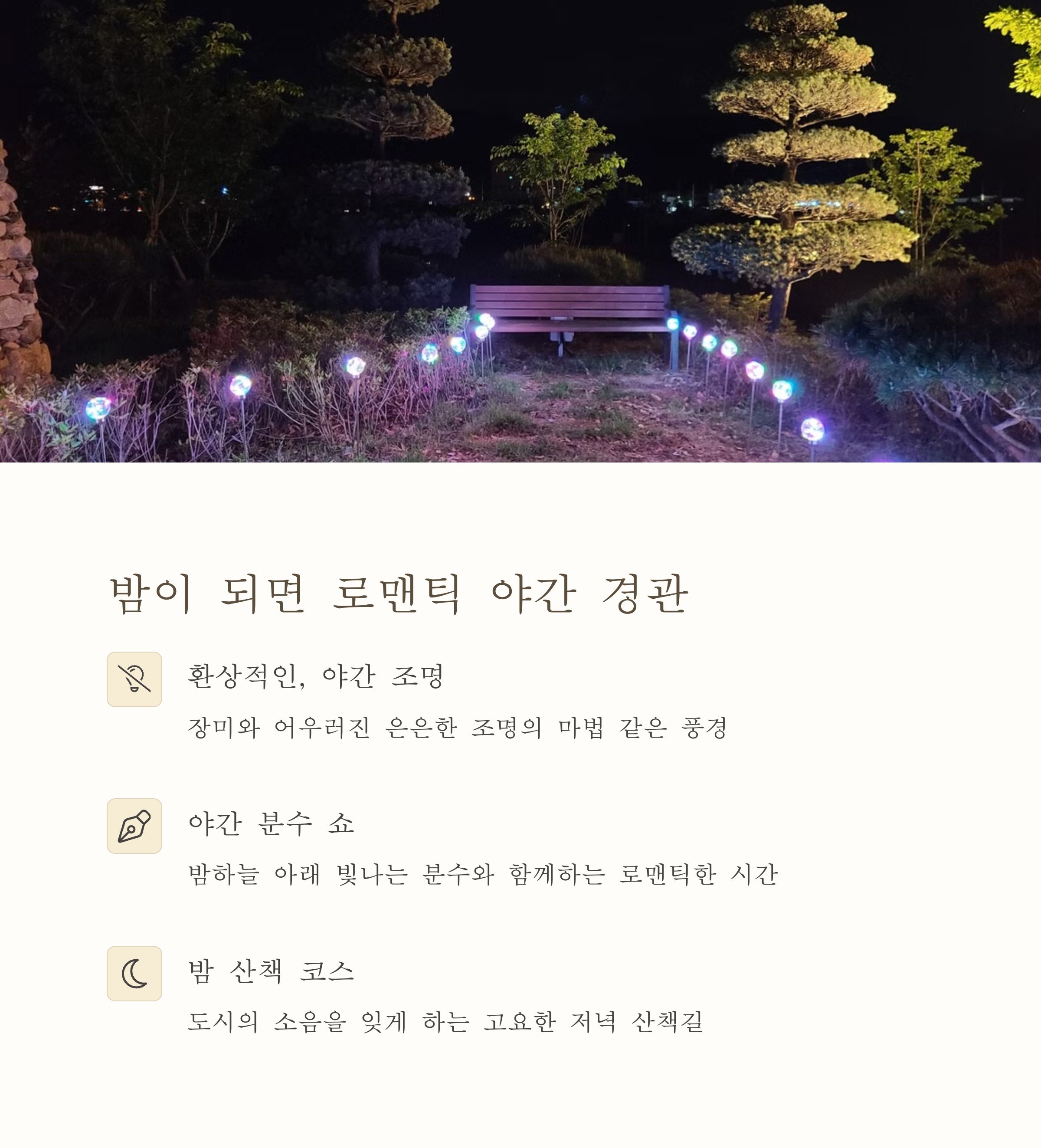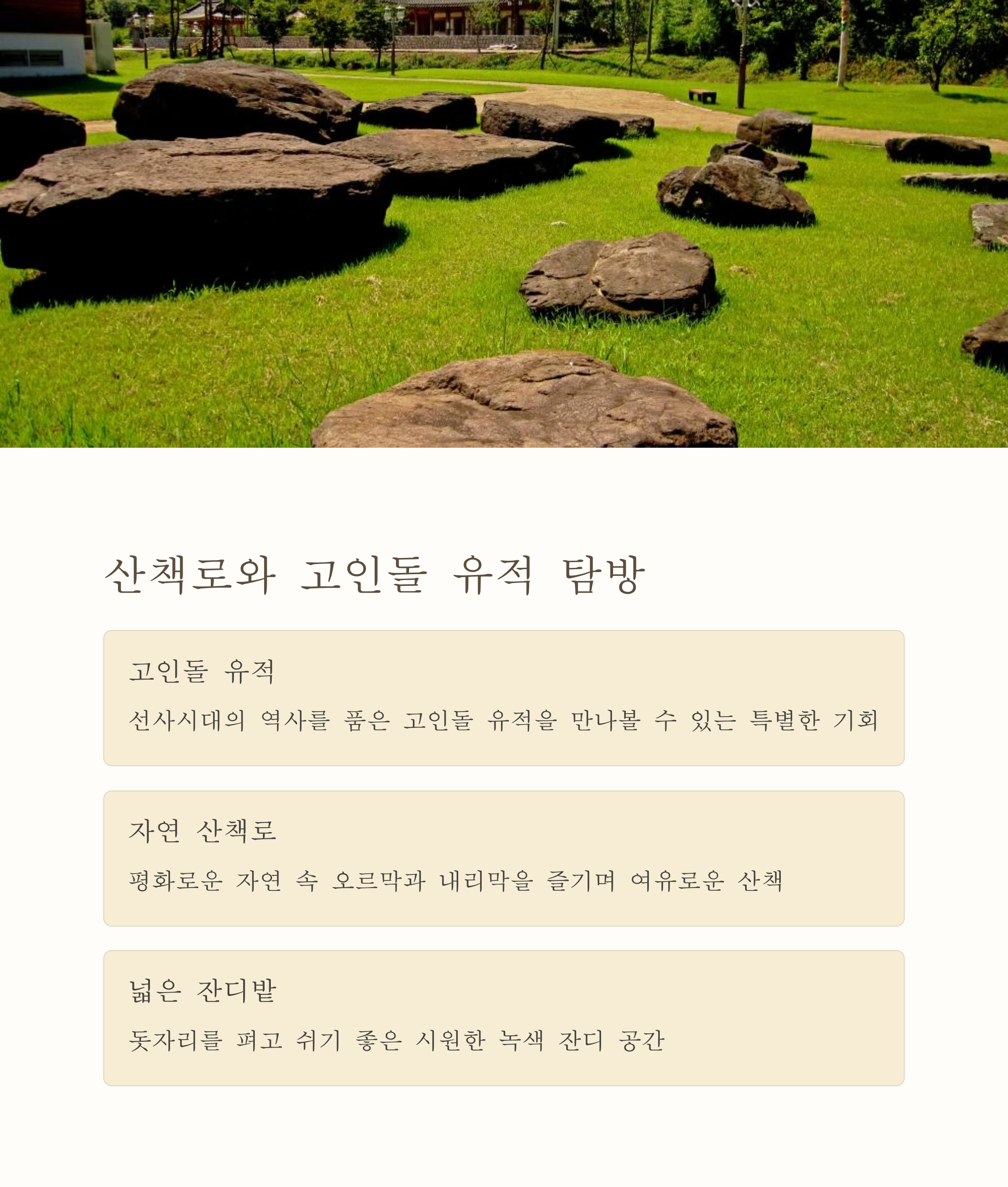 산책길을 따라 고인돌 유적지를 지나며, 자연 속에 녹아든 역사도 함께 체험할 수 있다는 점도 이곳의 특별한 매력입니다. 저녁이 되면 켜지는 야간 조명은 공원을 로맨틱하게 물들여 분위기 있는 데이트 코스로도 손색없죠. 부대시설로는 공연무대, 마을정원, 편의시설이 잘 갖추어져 있어 하루를 온전히 이곳에서 보내기에도 충분합니다.
