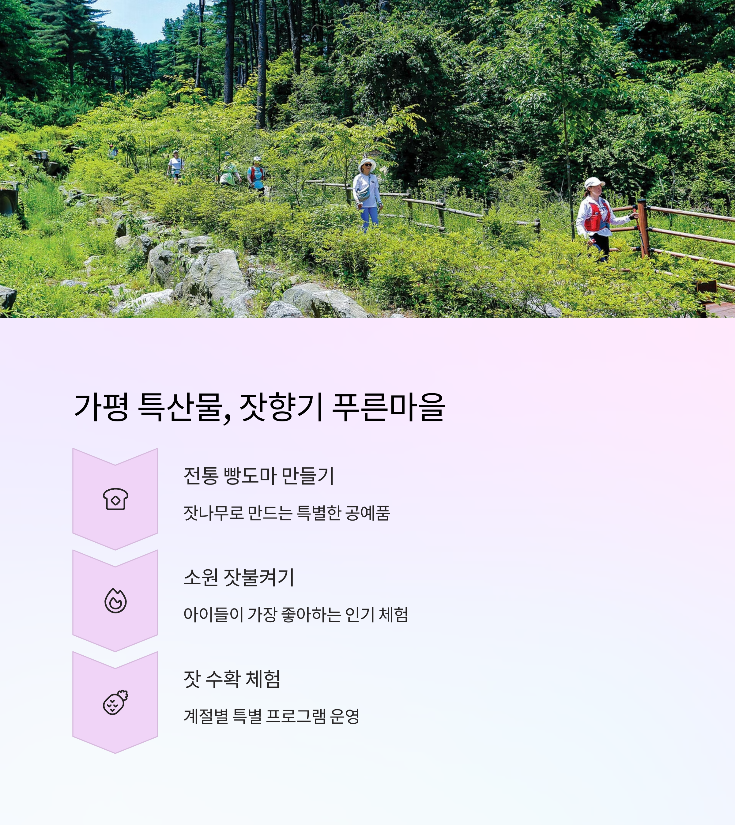 체험 활동은 계절에 따라 다양하게 준비되어 있어 사계절 내내 즐길 수 있습니다. 봄에는 자라섬 꽃축제에서 만나는 다채로운 꽃과 향기, 여름에는 시원한 계곡과 모터보트, 가을에는 단풍 속 자연 산책, 겨울에는 고즈넉한 농촌 체험 프로그램이 운영됩니다. 특히 잣불켜기나 고추장 만들기 같은 활동은 지역의 문화와 전통을 배우는 계기가 되어 아이들에게 매우 교육적인 시간이 됩니다.