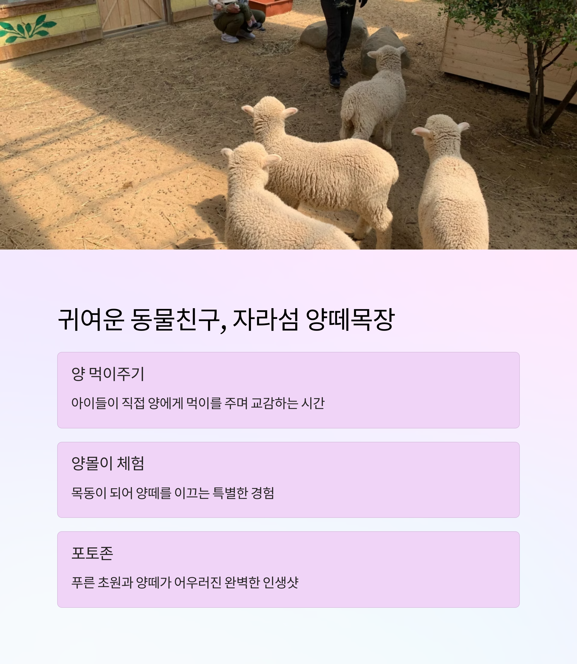 | 자라섬 꽃축제, 양떼목장도 인기 | 계절별 체험 프로그램 운영 | 자연학습과 힐링 동시 가능 |