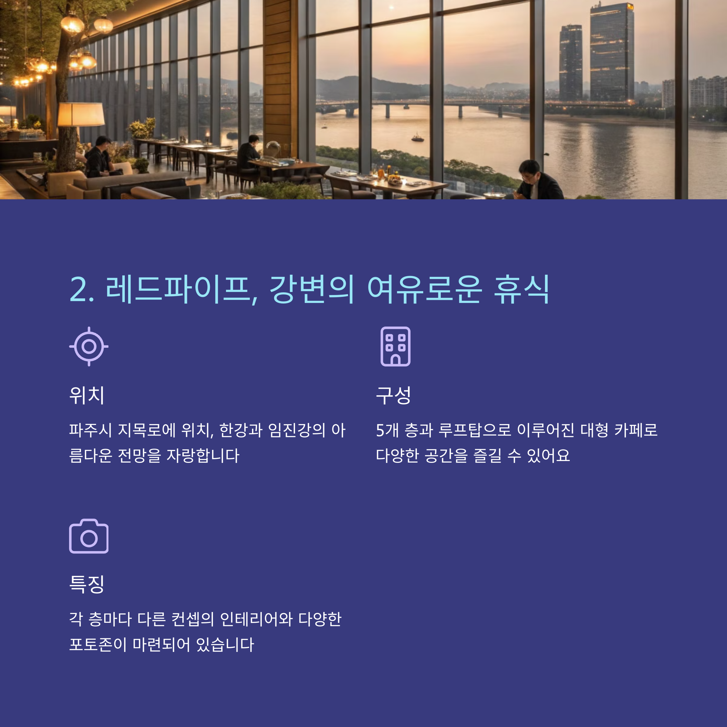 레드파이프는 한강과 임진강이 보이는 대형 카페로, 총 5개 층과 루프탑이 마련되어 있어 멋진 뷰를 감상할 수 있습니다. 각 층마다 다른 인테리어 컨셉으로 꾸며져 있어 포토존이 많으며, 브런치 메뉴와 커피가 맛있어 여유로운 시간을 보내기에 제격입니다.