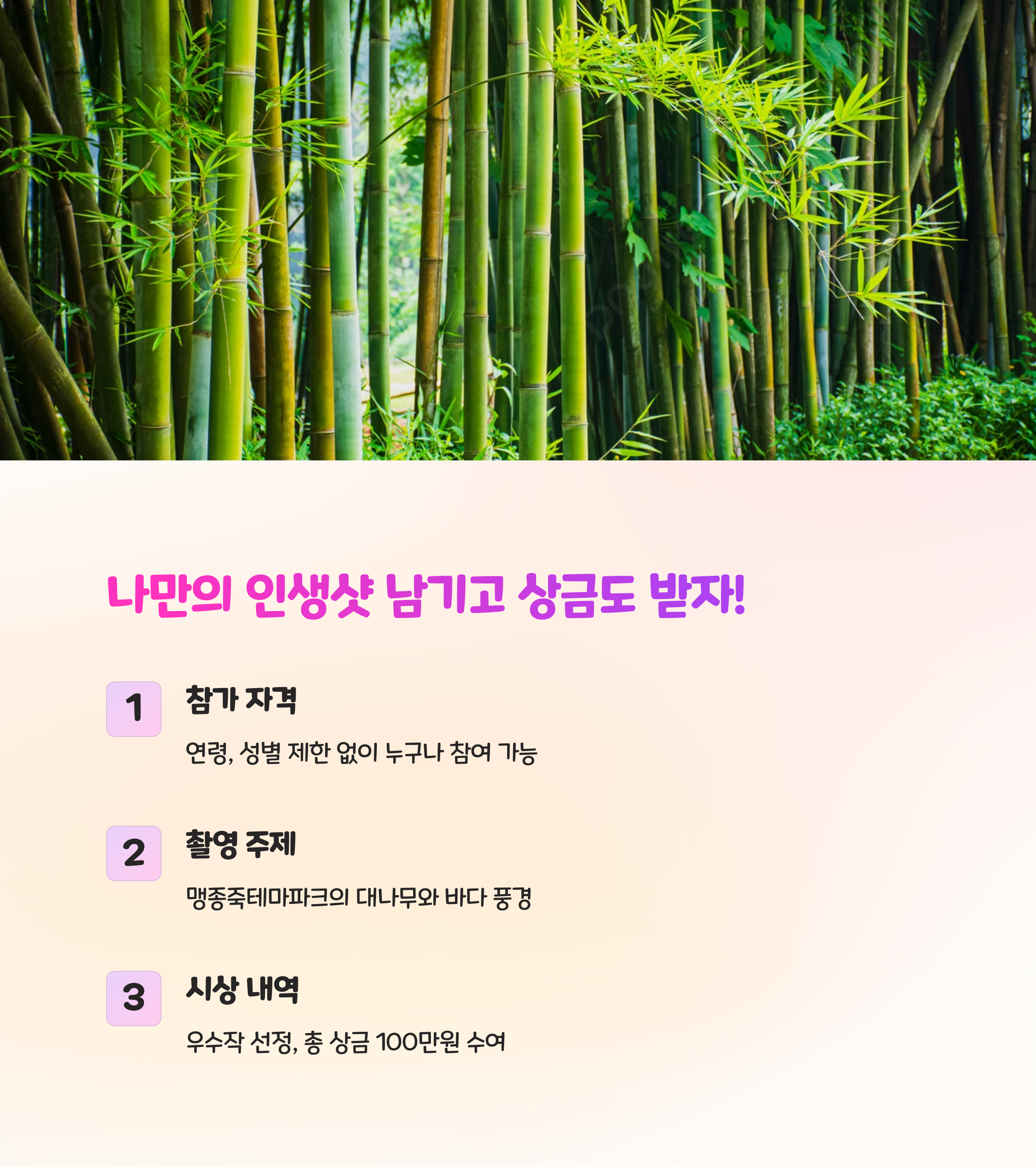 거제 맹종죽 테마파크는 단순한 관광지를 넘어 자연 체험과 식문화를 동시에 즐길 수 있는 복합형 테마 공간입니다. 죽순축제를 통해 계절 식재료의 맛을 경험하고, 대나무숲 산책을 통해 치유와 여유를 느낄 수 있어 봄철 나들이 코스로 추천할 만합니다. 특히 사진 공모전에 누구나 참여 가능하며, 수상작에는 총 100만원 상당의 상금이 주어져 축제의 재미를 더해줍니다.