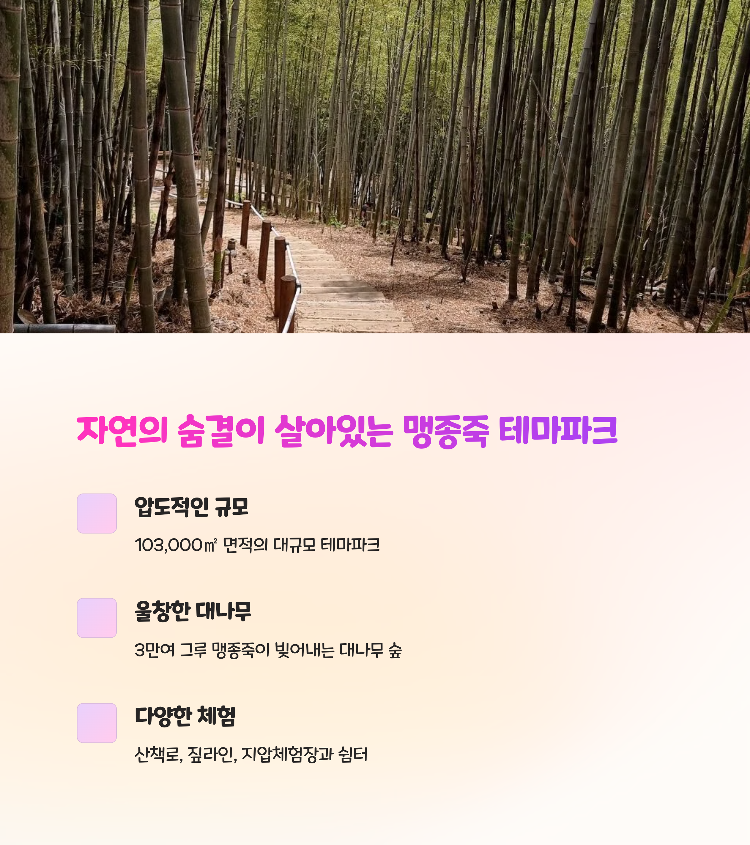 | 주요 체험 | 죽순 요리 시식, 대나무숲 산책, 사진 공모전 등 다양함 |