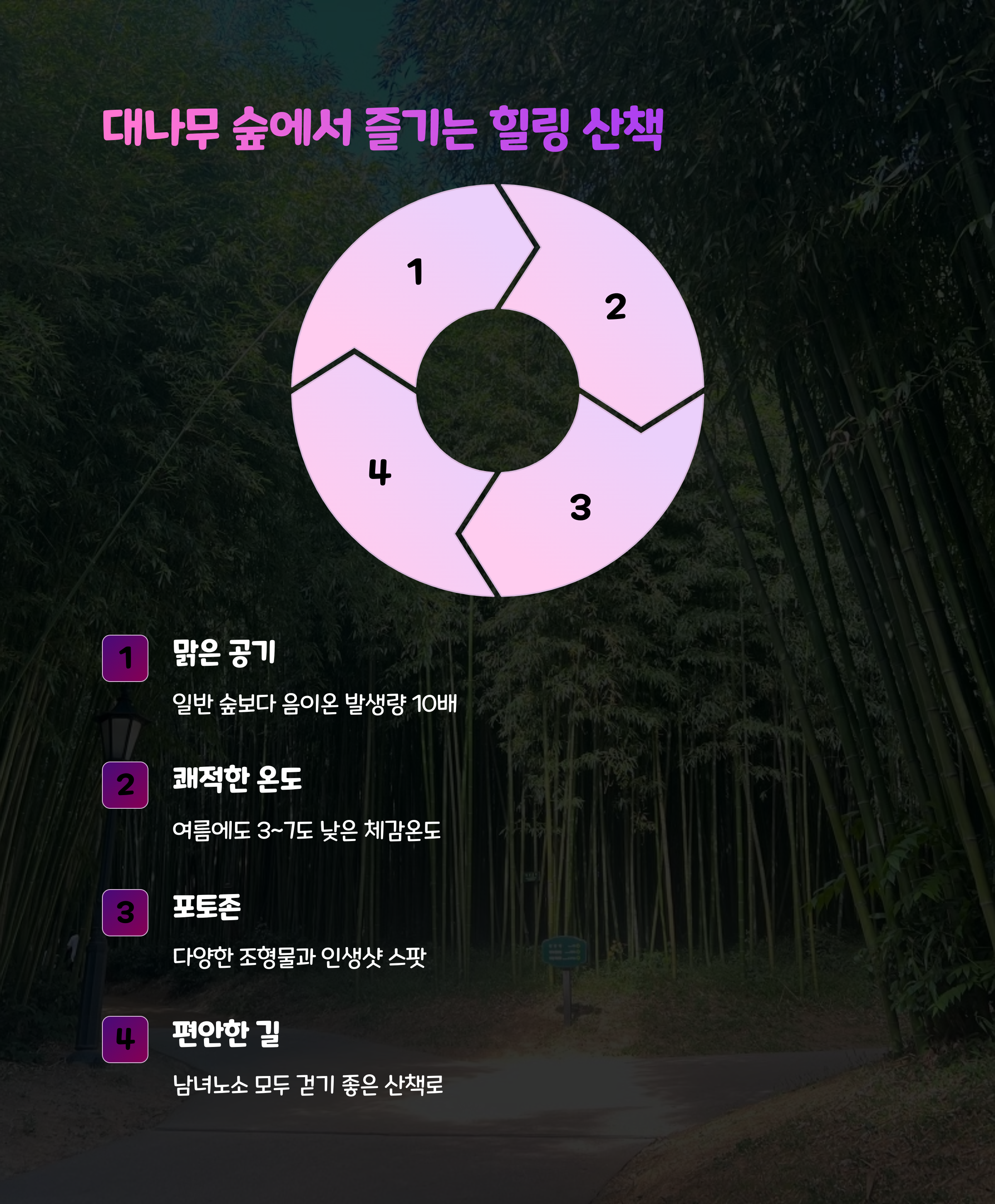 | 대나무숲 산책과 자연 체험 | 죽순 요리, 보물찾기 이벤트 등 가족 즐길거리 | 자연 속에서 열리는 이색 체험형 축제 |